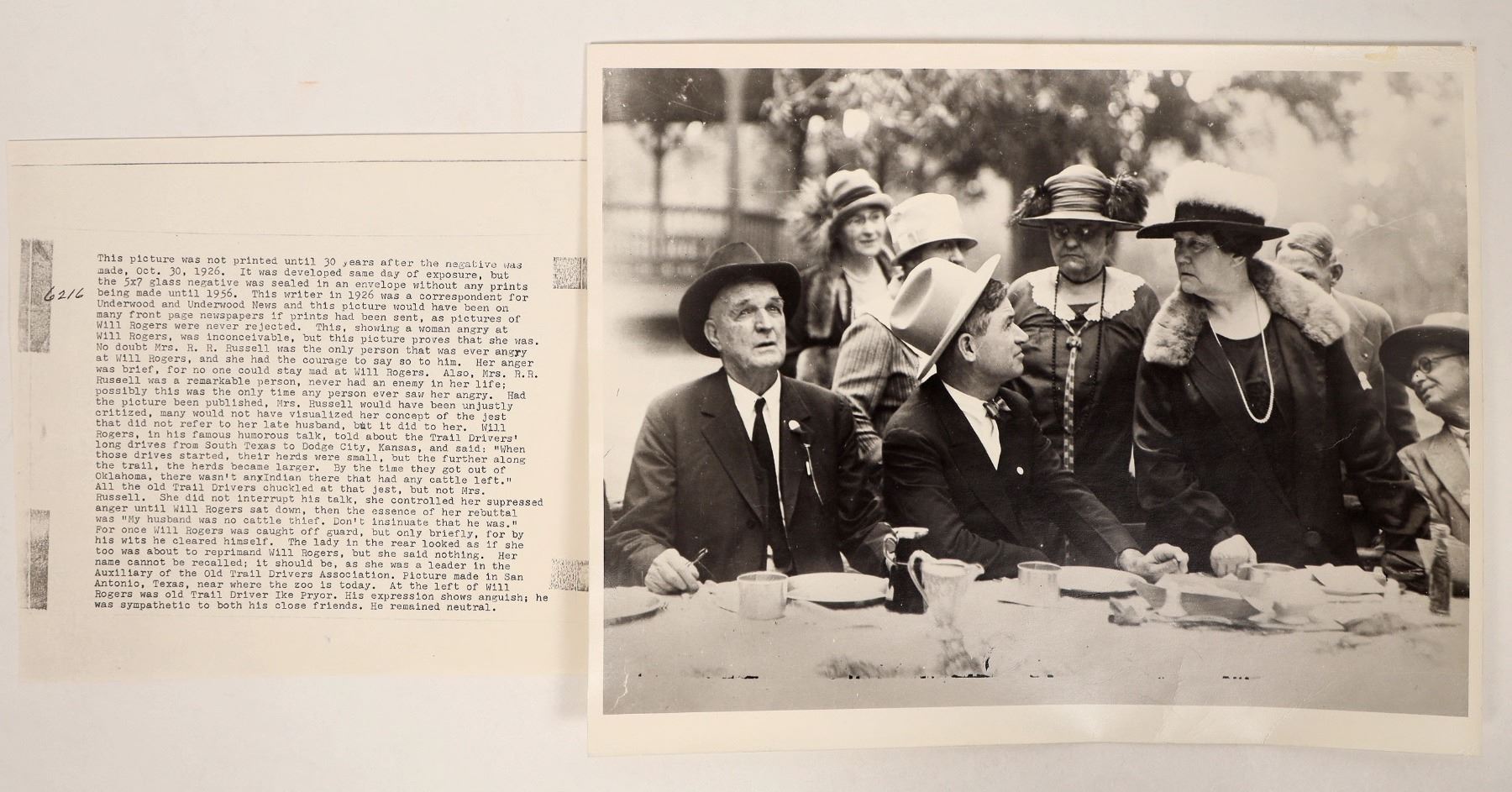 Photo taken on October 30, 1926 but not printed until 30 years later. Mrs. R R Russell is angry at Rogers for implying her husband was a cattle thief. See consignor supplied note sheet for all the details. Photo 11x14".