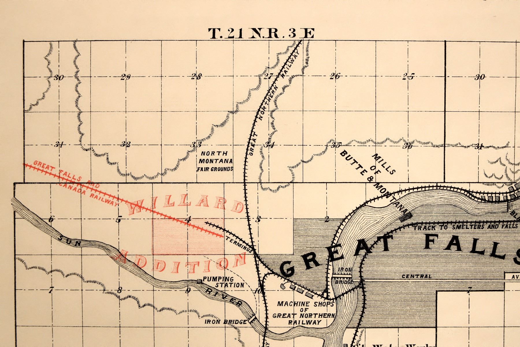 Possibly c. 1900 Rand McNally map of Willard Addition to Great Falls, Montana. Shows smelters, railroads etc. 16x16", no folds, some right edge wear. Please inspect.