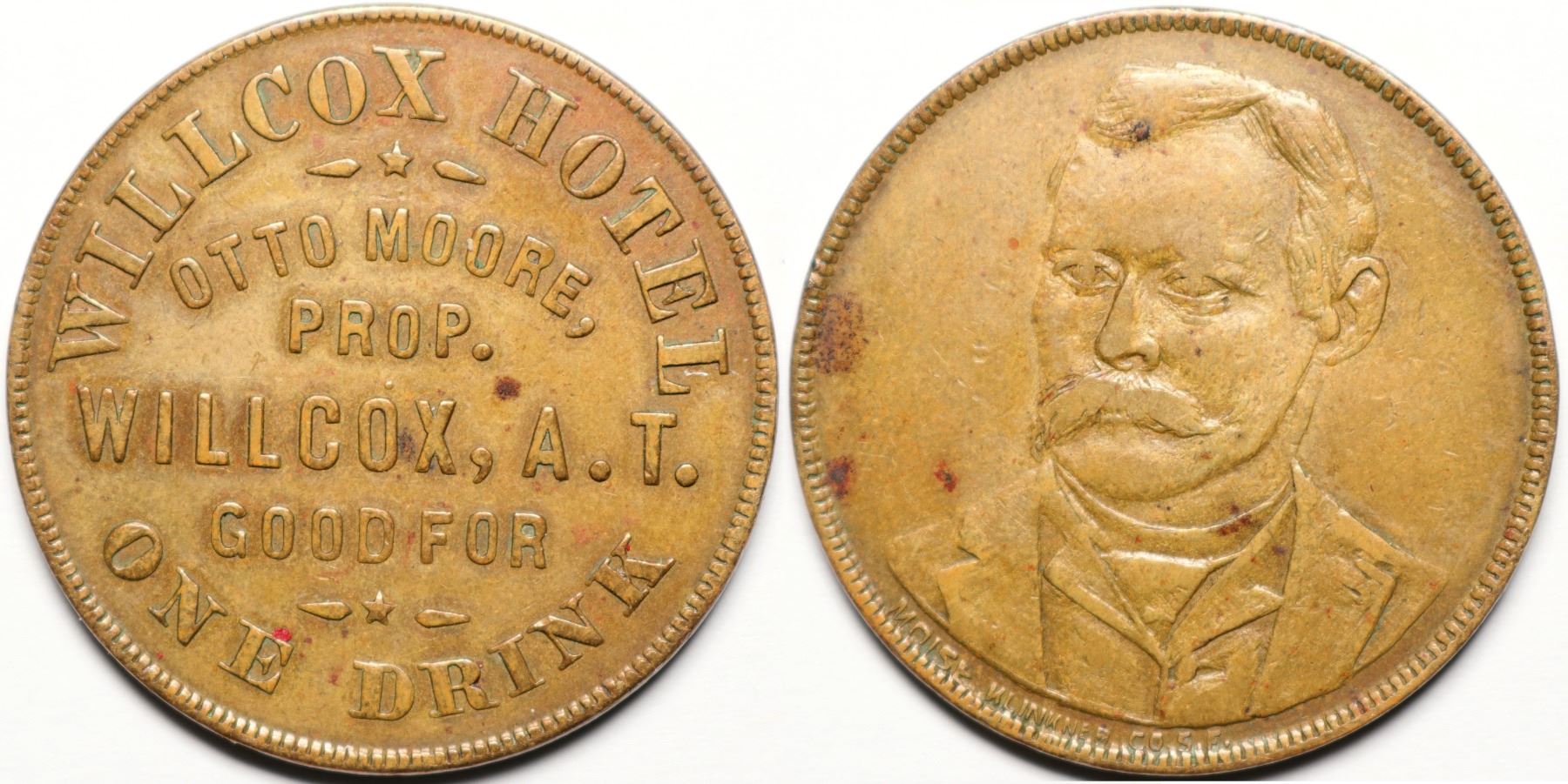 Willcox Hotel / Otto Moore, / Prop. / Willcox , A.T. / Good For / One Drink // (pictorial of Otto Moore?). Brass. Interesting that a man with a strong resemblance to Wyatt Earp is depicted on the front of the token--probably Otto Moore?