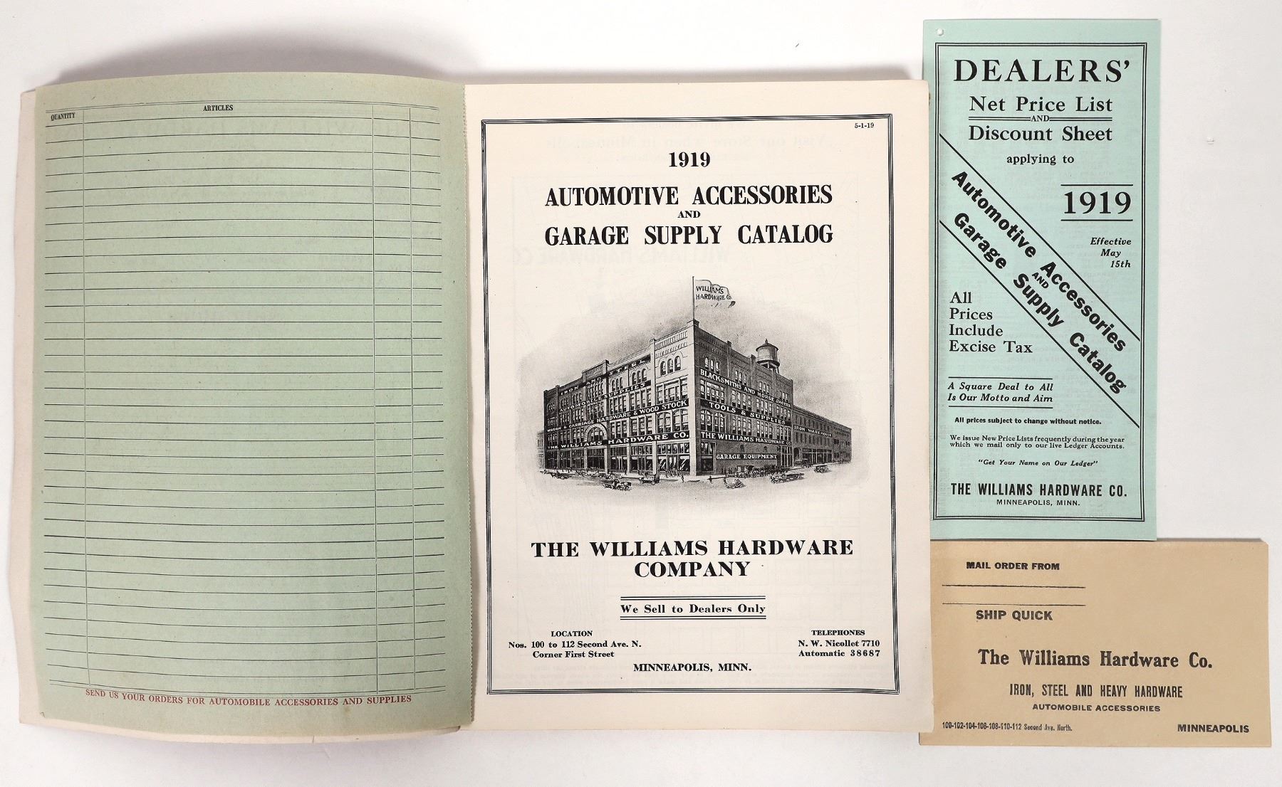 1919 Williams Hardware, Automobile Accessories and Garage Equipment catalog loaded with parts illustrations and separate dealer price list. Nice condition except for some small stains on back pages.