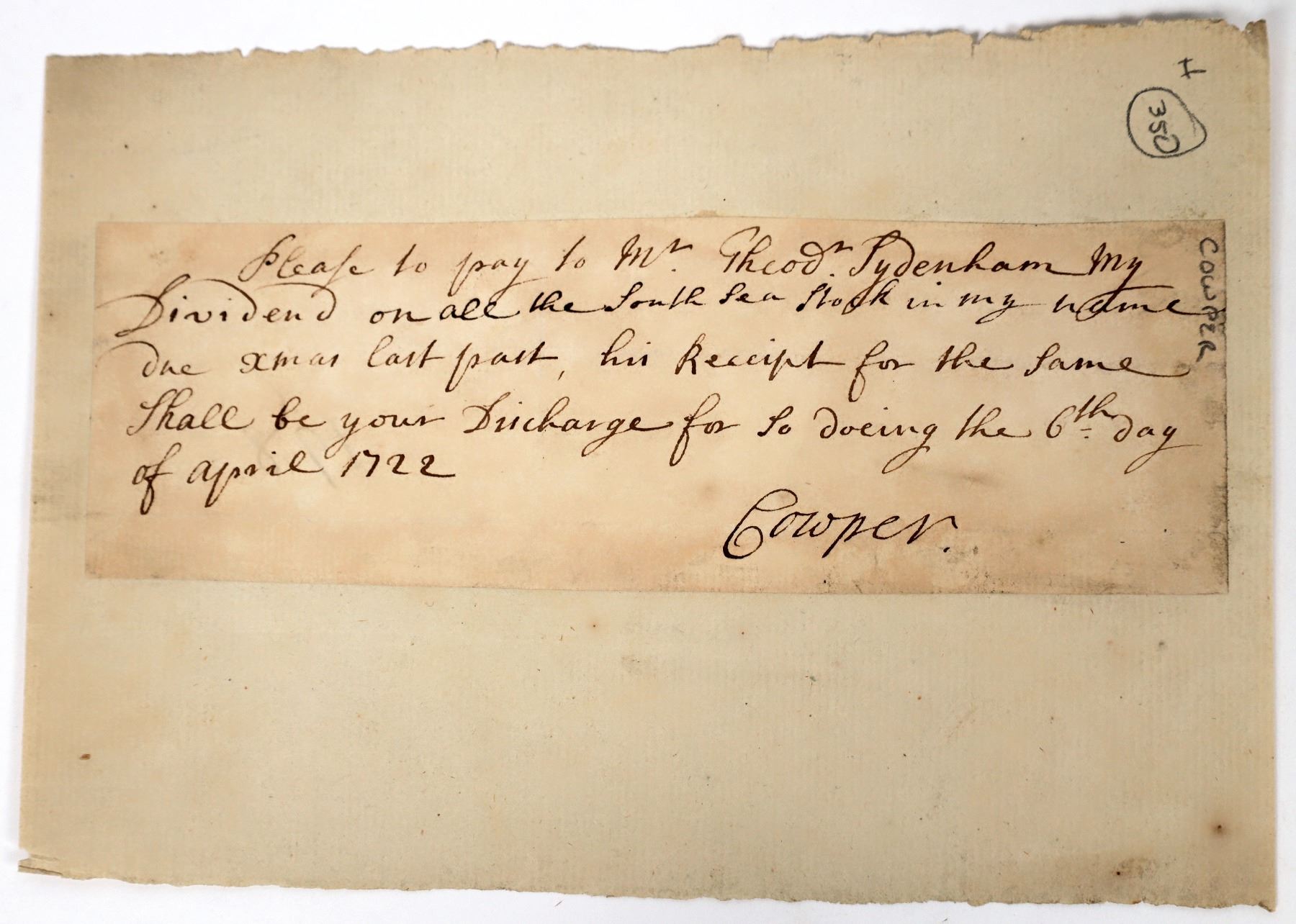 1722 letter regarding dividend on South Sea stock signed by Cowper. "William Cowper, 1st Earl Cowper, PC, KC, FRS was an English politician who became the first Lord High Chancellor of Great Britain. Cowper was the son of Sir William Cowper, 2nd Baronet, of Ratling Court, Kent, a Whig member of parliament of some mark in the two last Stuart reigns" from Wikipedia. 5.5x8" with backing. United Kingdom 1722 Jim & Barbara Sherman Private Western Mining Museum