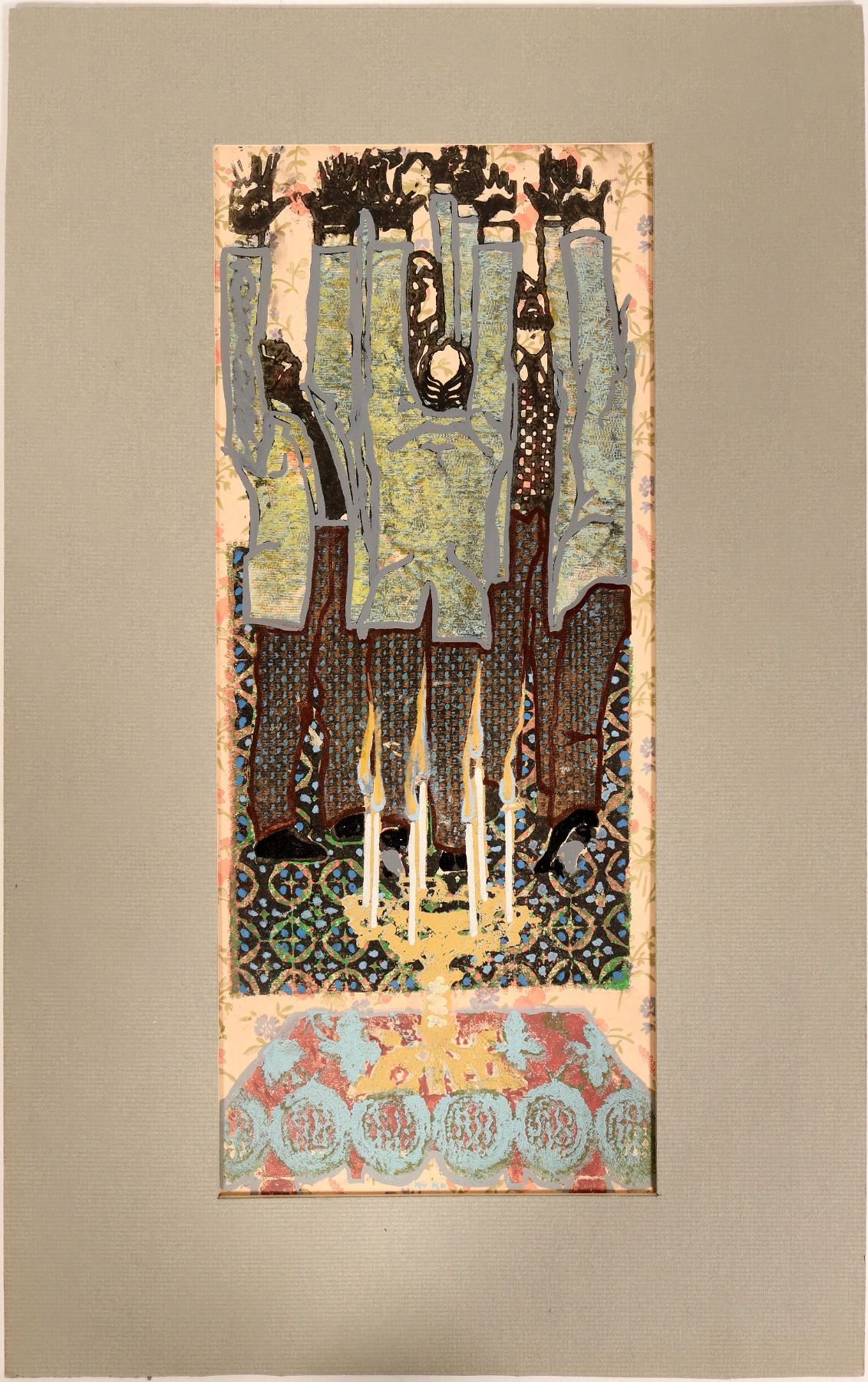 Quality Giclee print 7" x 15" matted, from original piece by William Forrest Martin. Color is so thick in places it appears to be as thick as oil paint. Very interesting piece of what appears to be some kind of religious scene with candelabra, alter and men reaching toward the sky as though in communion with a higher power. Worthy of professional framing and exhibit. One of two very similar pieces in this sale. This piece is matted on smoke blue and has lighter shades of sage green in picture, brighter blue circular pattern on red background on the bottom.