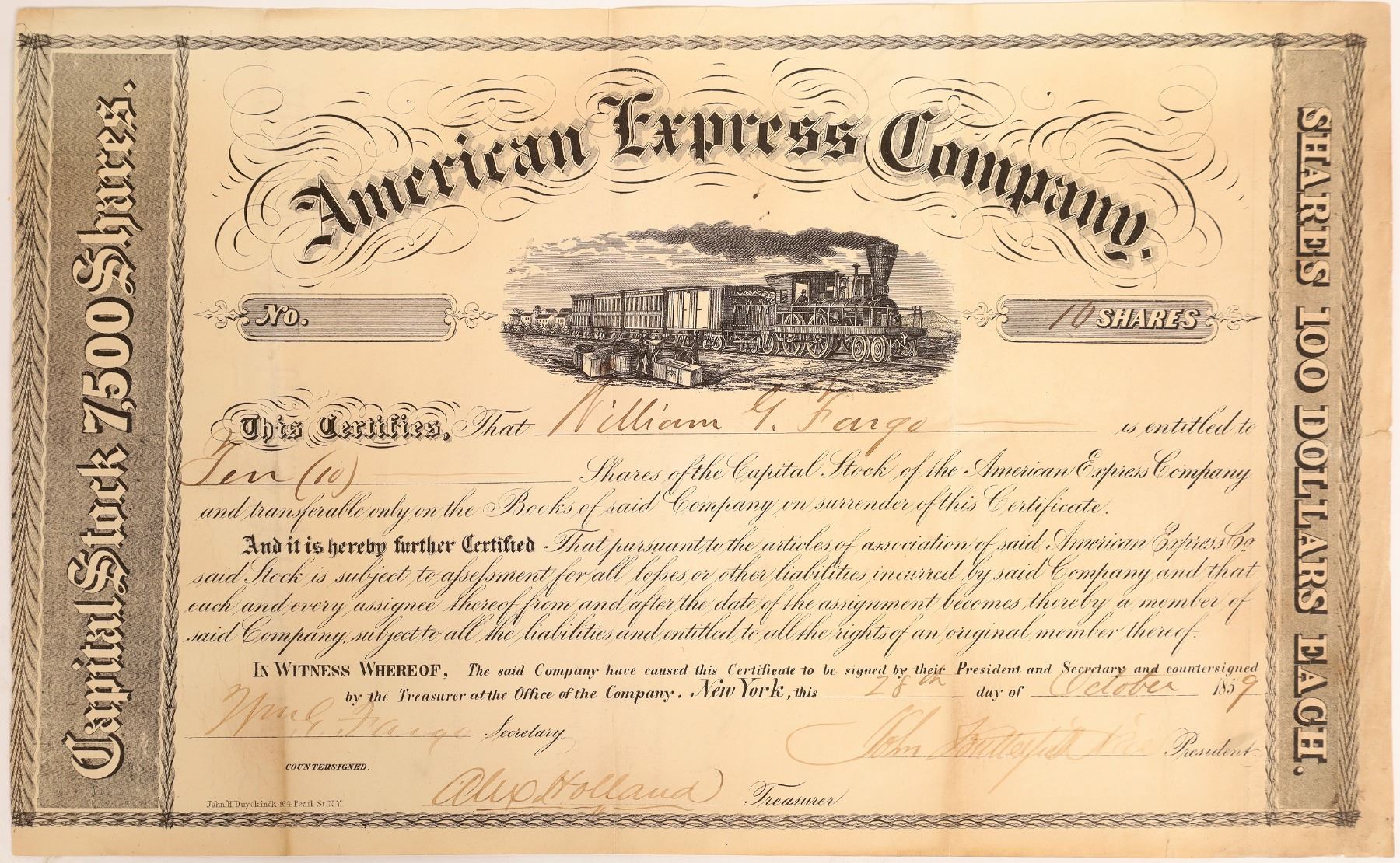Capital stock 7500 shares certificate. Certificate number is left blank. Issued for 10 shares on October 28, 1859 to William G Fargo. Signed by John Butterfield as VP, William G Fargo as Sec., Alex Holland as treasurer and endorsed by William G Fargo and Alex Holland on reverse. A rare pairing of two Fargo's and a Butterfield for this Wells, Fargo, Butterfield business family autograph certificate.