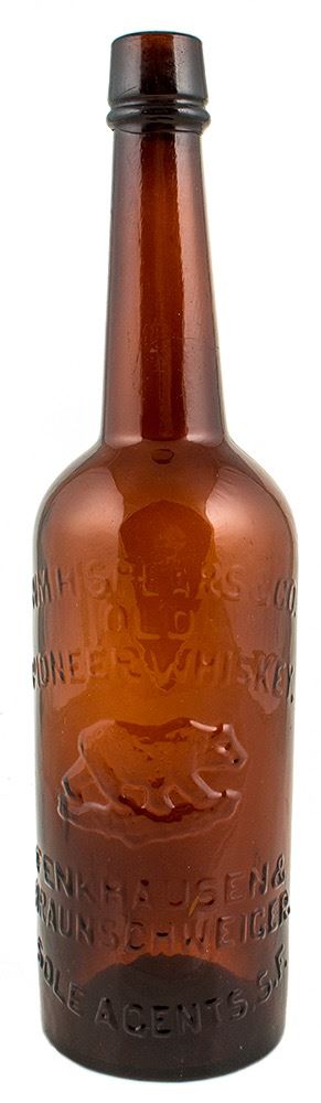 Pioneer Bear, William H. Spears Co., Old Pioneer Whiskey, Fenkhausen & Braunschweiger, Sole Agents SF. Thomas number 4. Circa 1880. Amber, applied top. This is the earliest variety of the four different bear picture whiskey bottles (walking bear) listed by Thomas. This bottle is from a very old California collection and undoubtedly is one of the first of the specimens logged in by Thomas when he published his first edition in 1969. Medium red Amber. Bright vibrant. Minor wear, show signs of professional polish on the back. City: San Francisco State: California Inventory Number: 38172