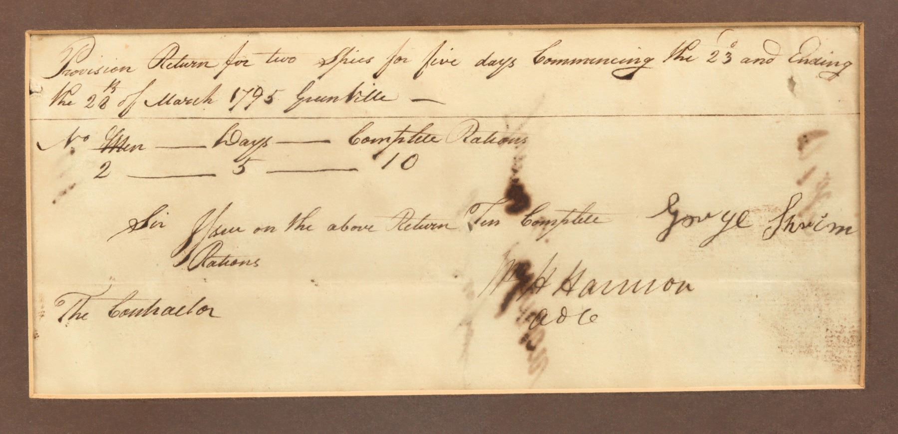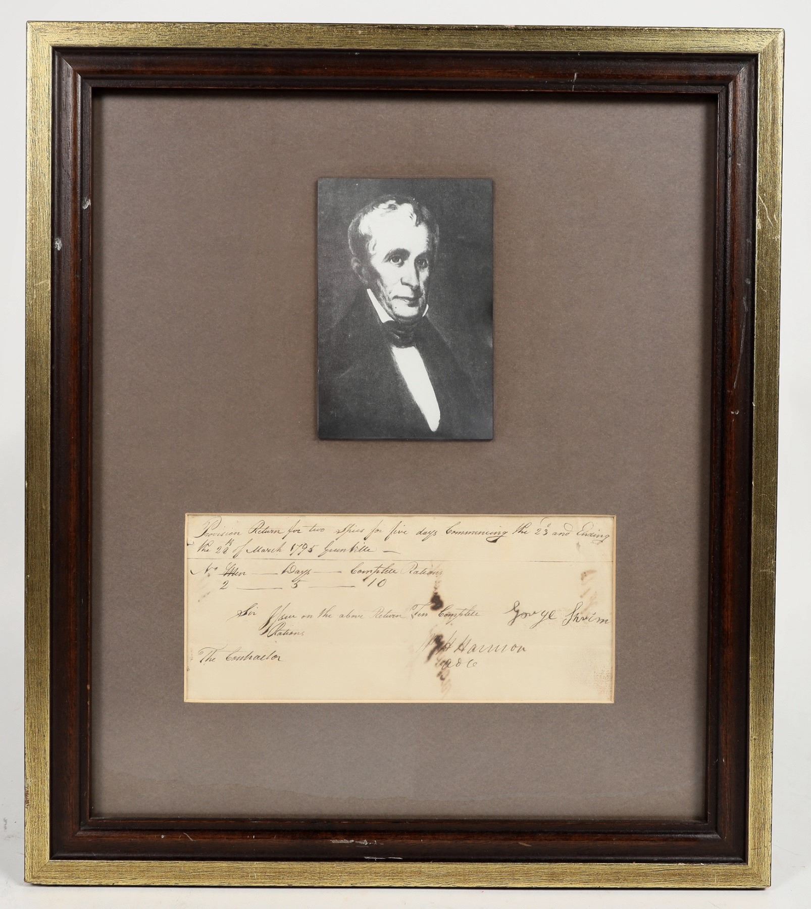 15.5" x 13. 3/4" framed dimensions. "Provision return for two spies for 5 days. March 23 - Mar 28, 1795" signed by Wm Henry Harrison, the 9th president of the US from March 4 - April 4 1841 as the shortest presidency in US history. He died in office after becoming ill with pneumonia.