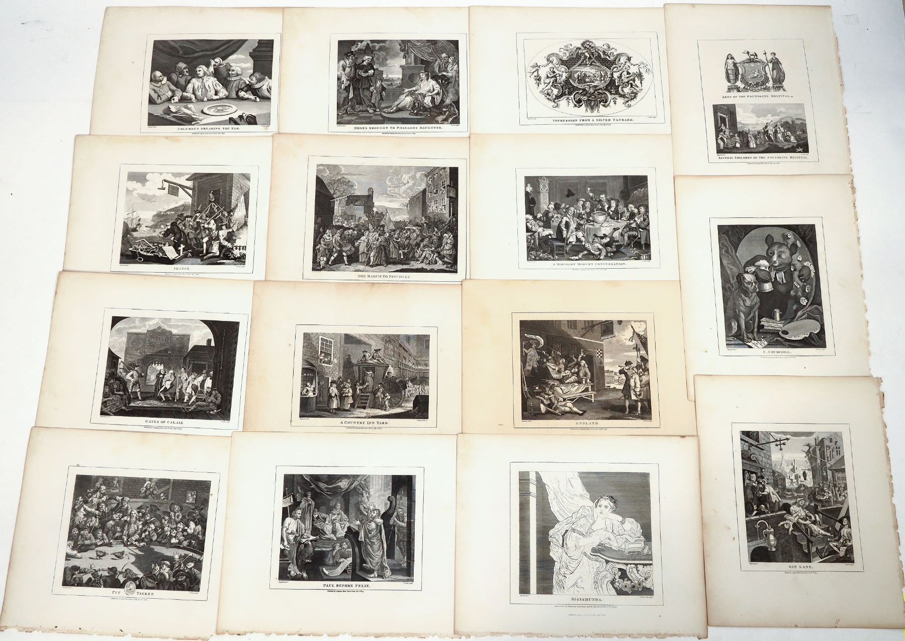 A nice grab bag of William Hogarth woodblock prints. Each measure about 6"x 7", with a full sheet measuring 9"x 11". These were published by Longman, Hurst, Rees & Orme in and around 1807-1809. Titles include "Moses Brought to Pharaoh's Daughter," "Columbus Breaking the Egg," "Gates of Calais," "Gin Lane," "A Country Inn Yard" and more. There is a ragged edge on all that doesn't affect the print. Some age foxing. Please see photos for more details.