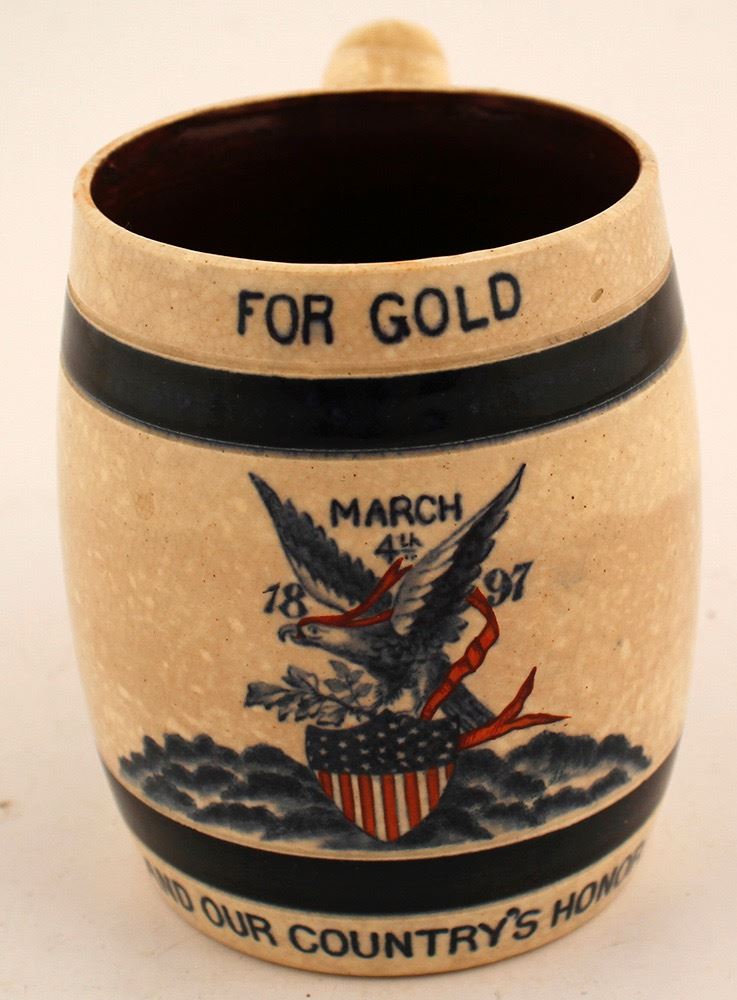 William McKinley Presidential Inauguration mug. FOR GOLD / MARCH 4TH 1897 / AND OUR COUNTRY'S HONOR. He endorsed the gold standard. Approx 4.25" tall with an eagle carrying a red, white and blue shield. 2 blue trim bands. Date: 1897 Location: HWAC# 59771
