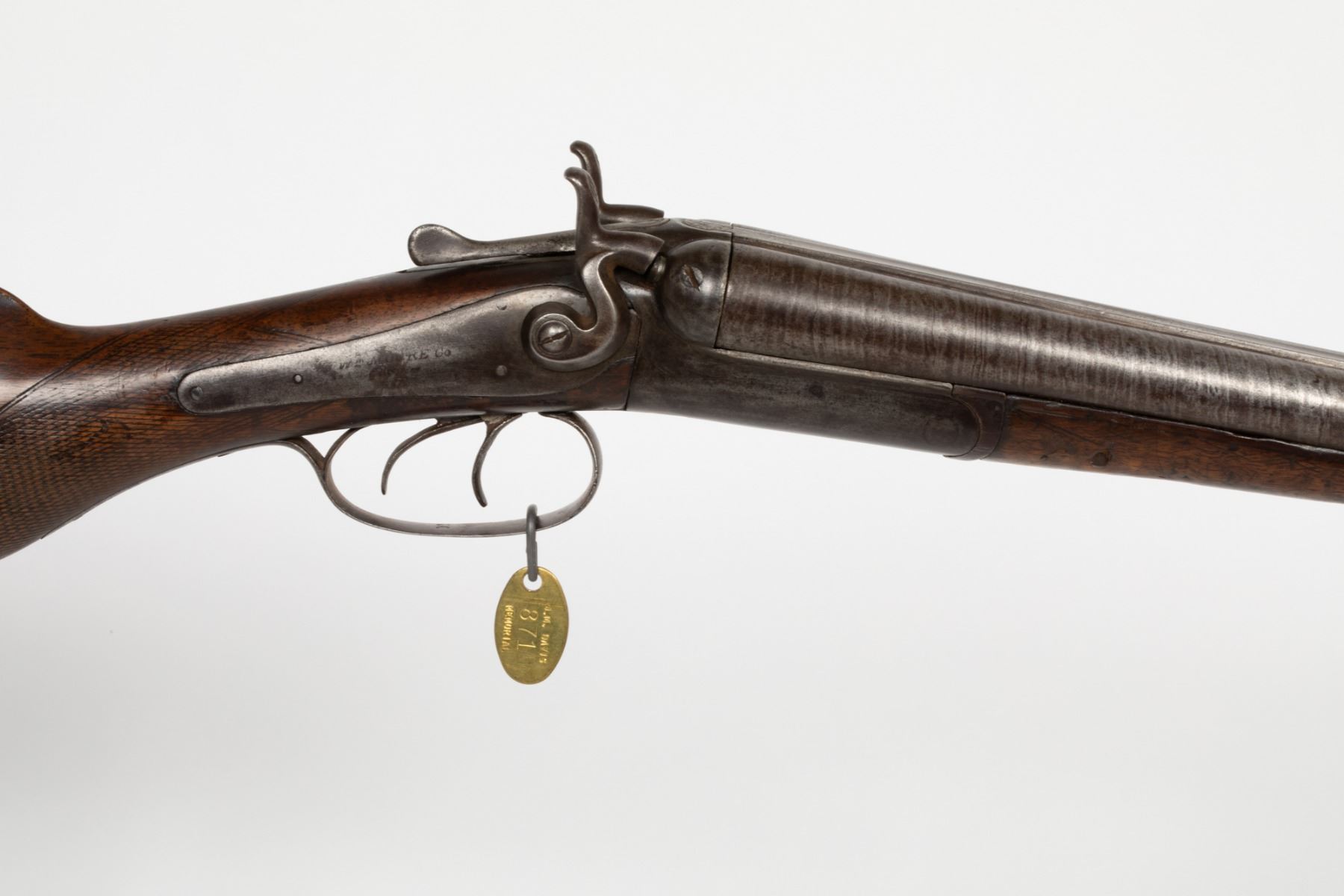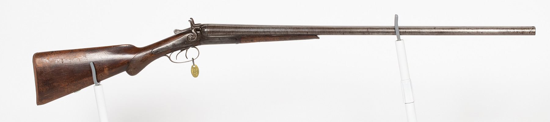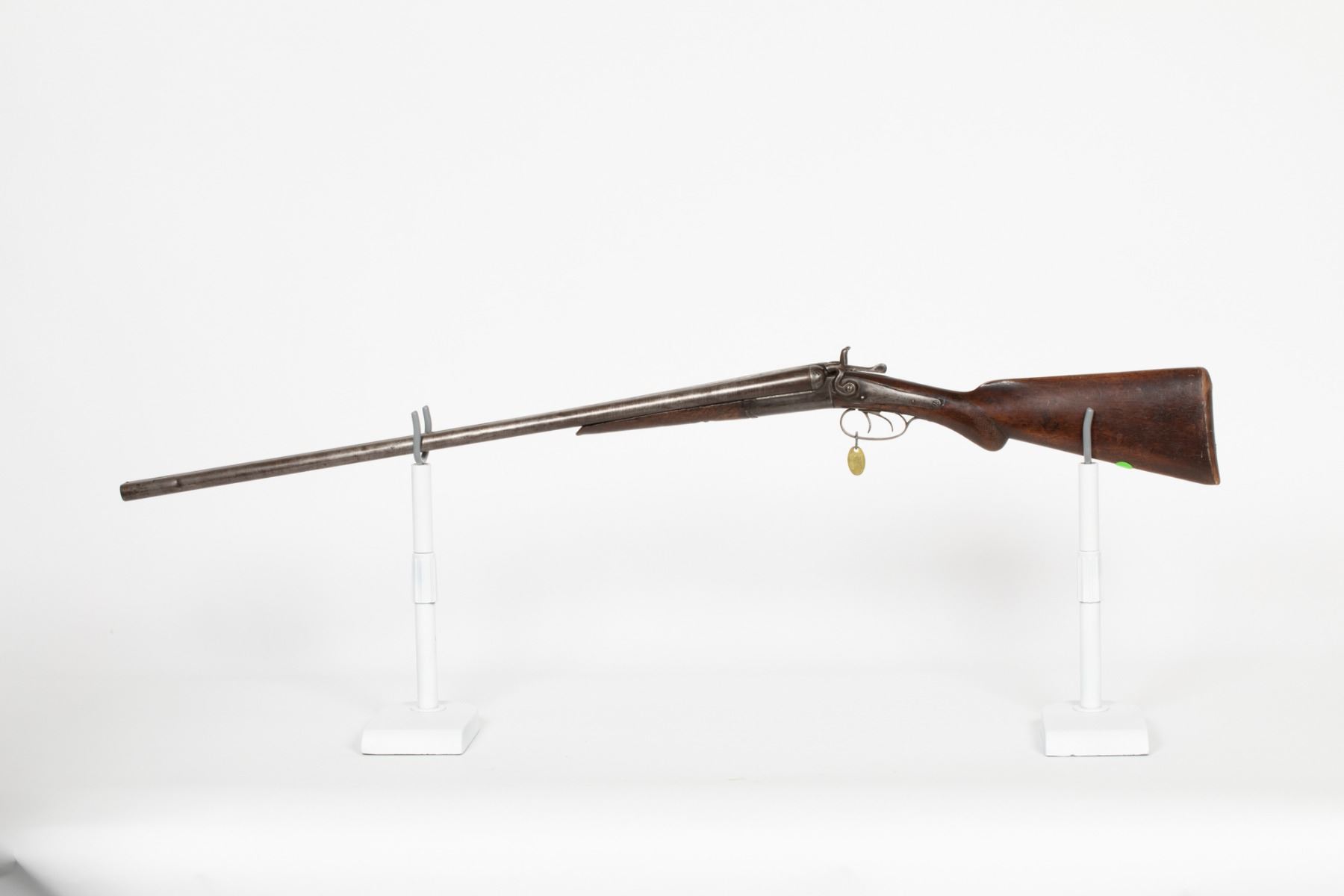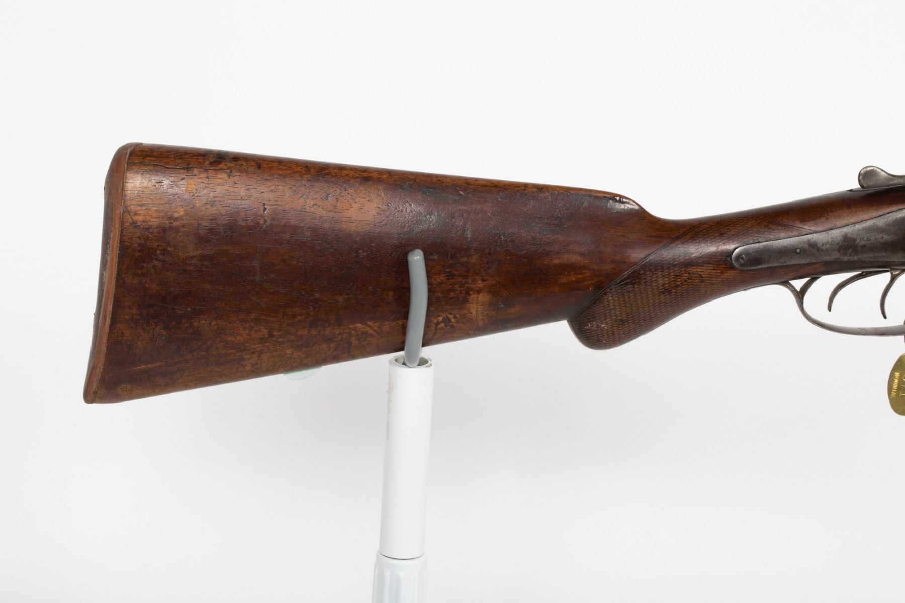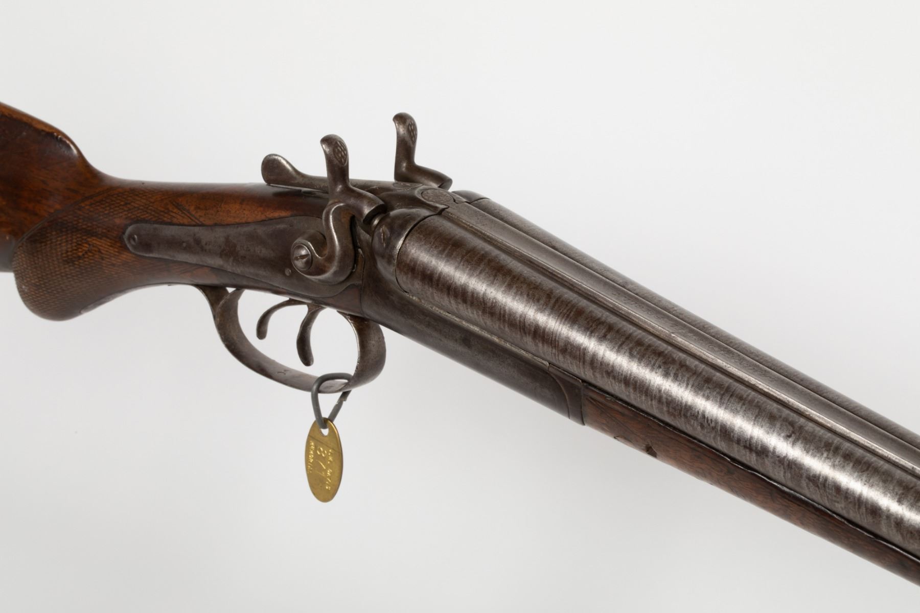 Very nice black-powder. laminated Barrels, rare caliber. Damascus black-powder cartridge Hammer shotgun. Back-action lock SN: 67091, JMD Oval Tag: 871, Condition: Very Good, >