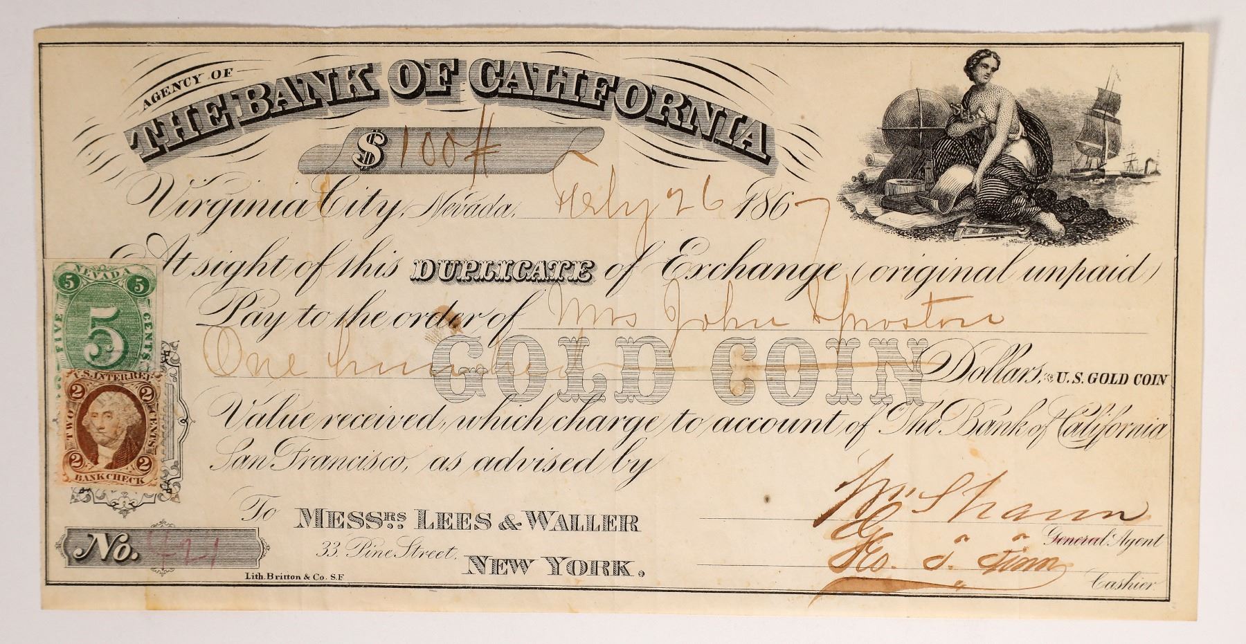 Issued 1867 Bank of California check signed by William Sharon. US and Nevada adhesive revenue stamps. "William Tang Sharon was a United States senator, banker, and business owner from Nevada who profited from the Comstock Lode. Sharon moved to California in 1849, accompanied by his friend John Douglas Fry (July 1, 1819 – February 3, 1901). Sharon and Fry engaged in business together for a short time in Sacramento. Sharon then moved to San Francisco in 1850, where he dealt in real estate. In 1852, he married Maria Malloy (Quebec, 1832 – San Francisco, May 14, 1875). He moved to Virginia City, Nevada in 1864 as manager of the branch of the Bank of California and became interested in silver mining. Sharon was a business partner of Darius Mills and William Ralston, as well as the Nevada agent for the Bank of California. The bank profited greatly from loaning money to mining and milling operations and then foreclosing on those operations when the owners defaulted. The Bank of California owned mines as well as reduction mills, which Sharon controlled. In his efforts to monopolize the Comstock mining region, Sharon directed mined ore be sent to this mill or that, and affectively “starved out” competition, i.e. those who had come to the bank for loans. The bank also built and owned the famous Virginia and Truckee Railroad. William Sharon acquired many of Ralston's assets in 1875 when Ralston's financial empire collapsed and he died. He was thought by some of his contemporaries to have actually aided the collapse. He certainly was the main beneficiary of Ralston's assets. Those assets included the Palace Hotel in San Francisco and Ralston Hall in Belmont, California." from wikipedia Virginia City Nevada Franklin Collection