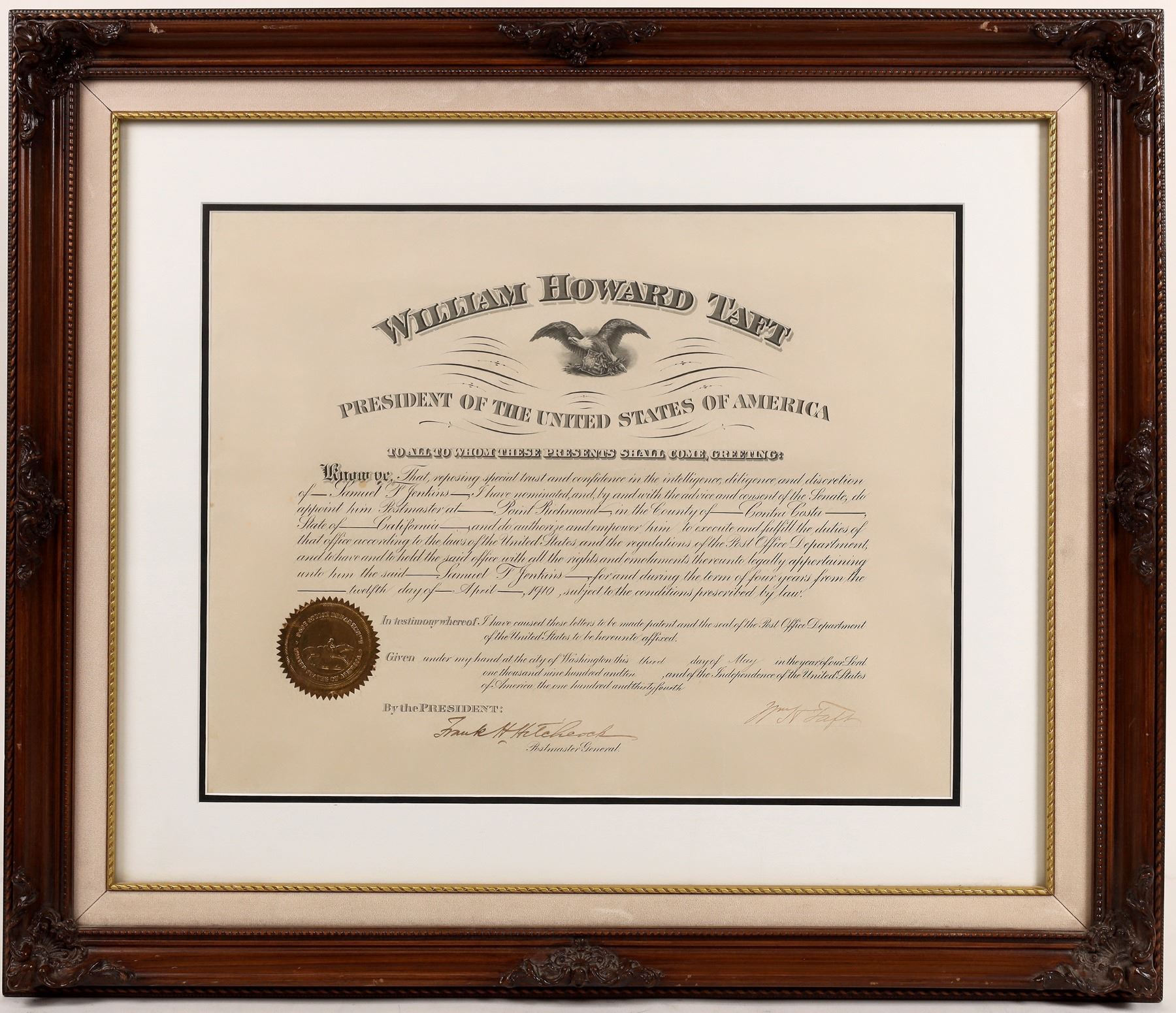 Framed choice 1910 Post Office Department document signed by William H Taft, 27th President of the United States 1909-13, appointing Samuel F Jenkins as Postmaster of Point Richmond, CA. California