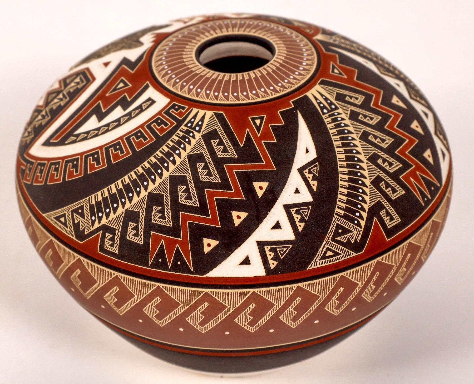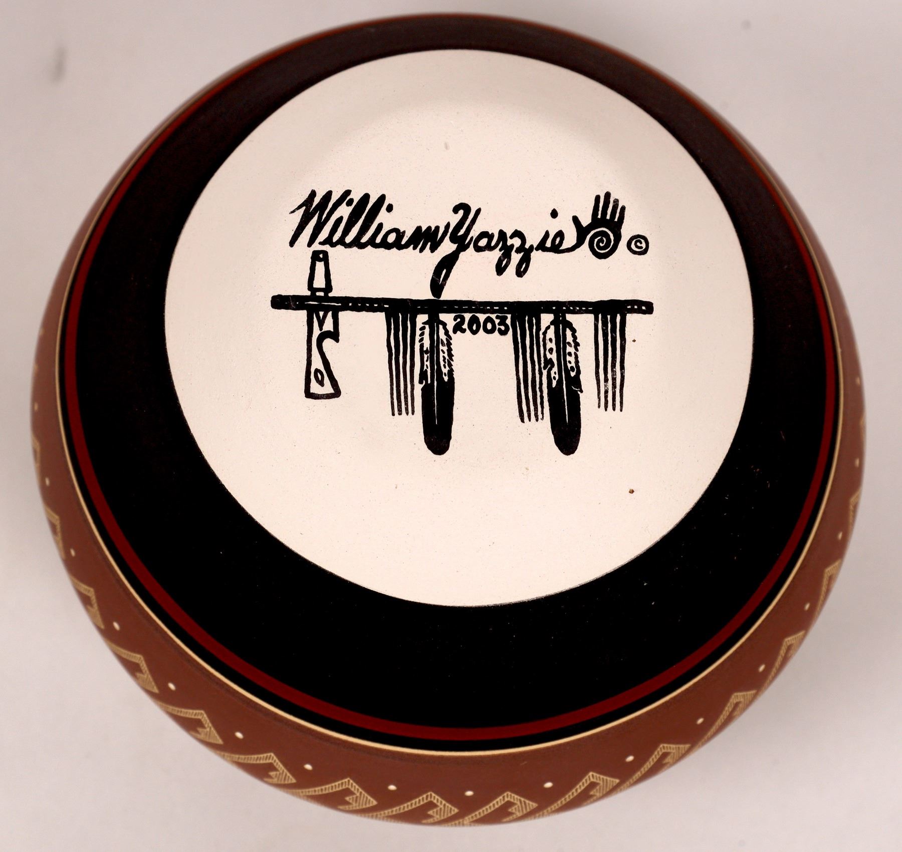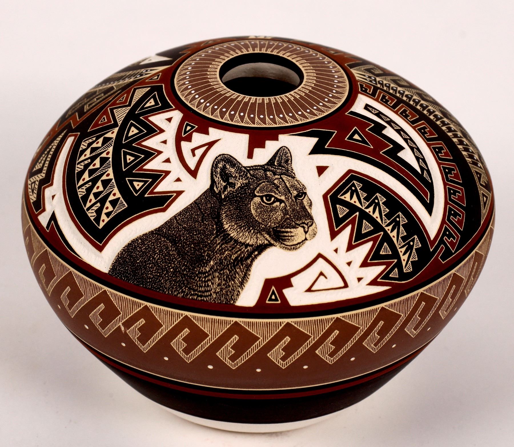 William Yazzie, Navajo artist, currently lives in Utah. Each piece of pottery involves many hours of hand carving and is unique. Mountain Lion (Cougar) design, deeply carved sgraffito geometric designs inspired by nature. 3" x 4".