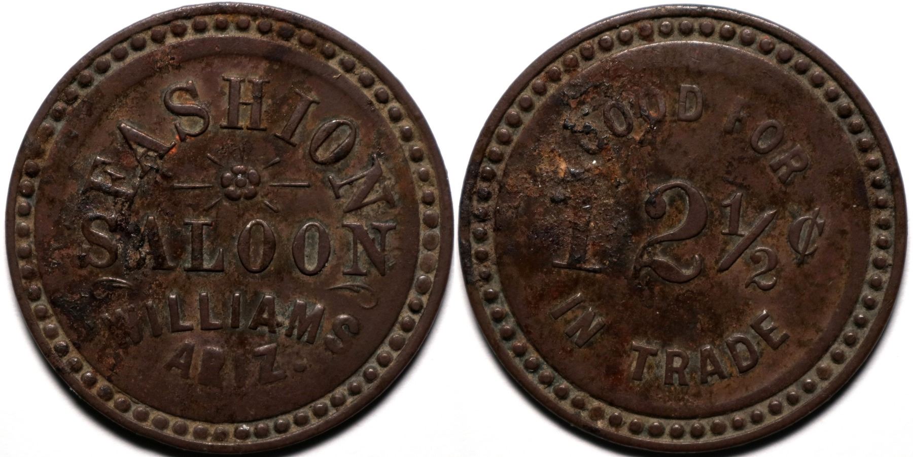 Fashion / Saloon / Williams, / Ariz. // GF / 12 1/2c / In Trade. Round, brass, 1-1/4" R-9