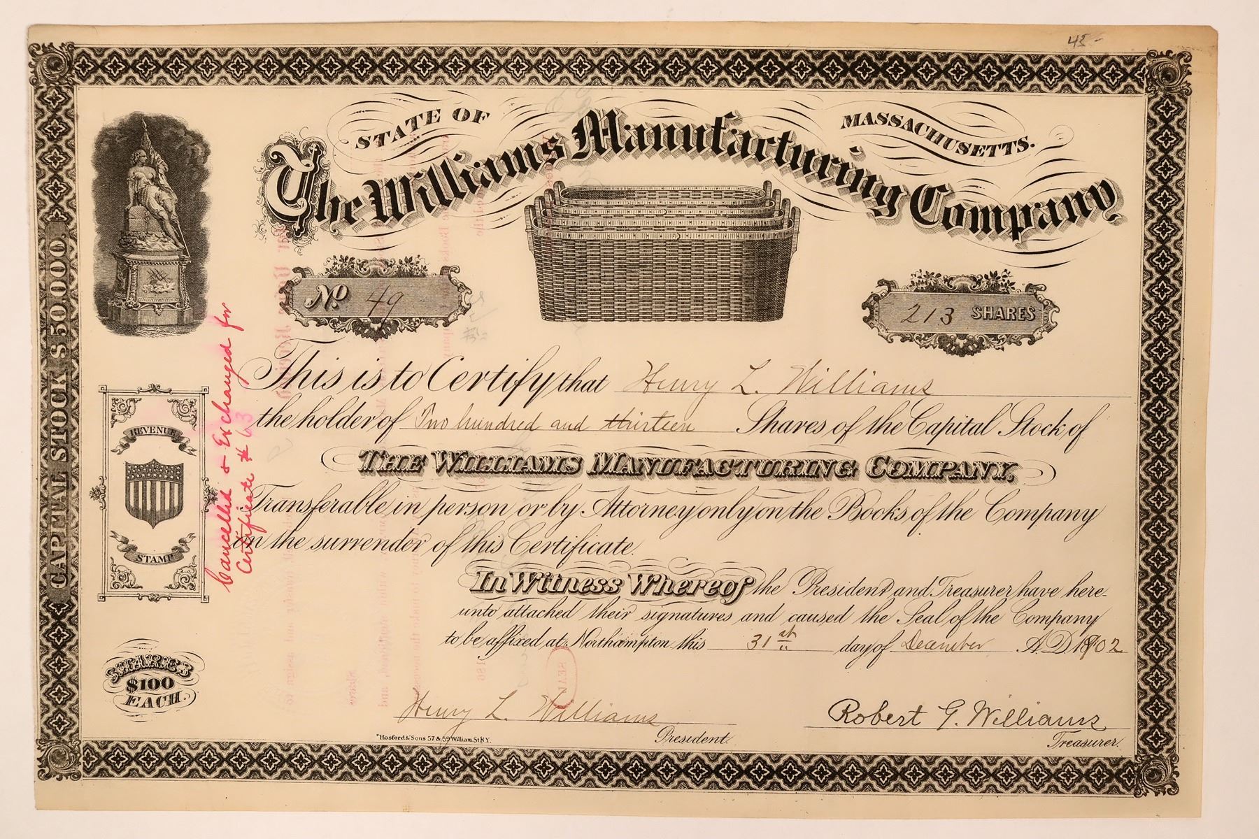 Great vignette of the baskets that this company produced. Certificate #49, 213 shares issued to Henry L Williams who also signed as President while Robert G. Williams was Treasurer.