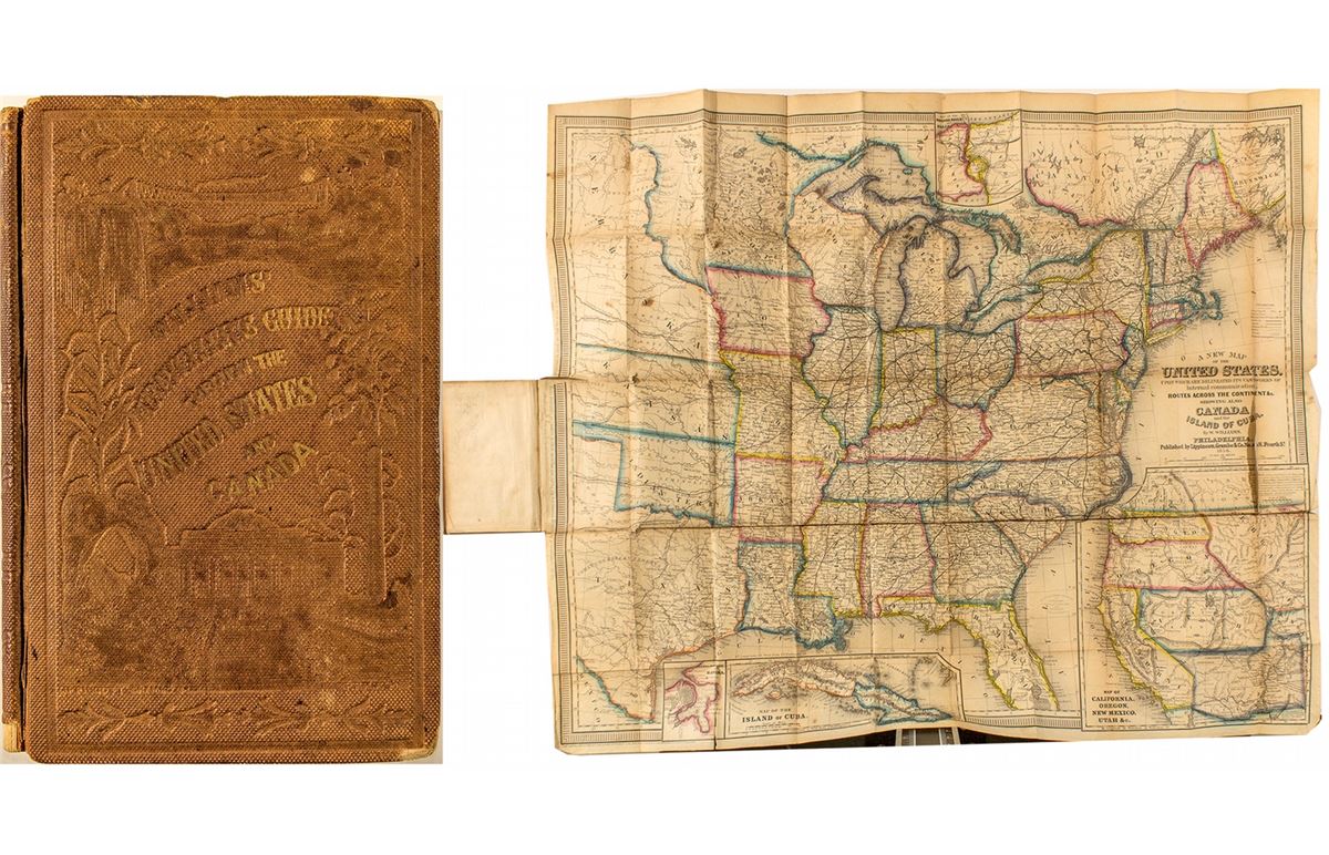 Exhibiting the various routes of travel, with explanatory notes, and other useful information, together with descriptions of, and routes to, the prominent places of fashionable and healthful resort. Hard maroon cover, design and most of gold type faded, blind embossing front and back. (6" x 4") 245 pp. Accompanied by a valuable and authentic Map of the Unted States (25" x 29.5"). Map is titled: A New Map of the United States. Upon which are Delineated Its Vast Works of Internal Communication. Routes across the Continent, etc. Showing also Canada and the Island of Cuba. By W. Williams, published by J. B. Lippincot, Grambo & Co., Philadelphia, 1856. Map is fragile, some tearing at folds. inside pages have some foxing. Used condition.
