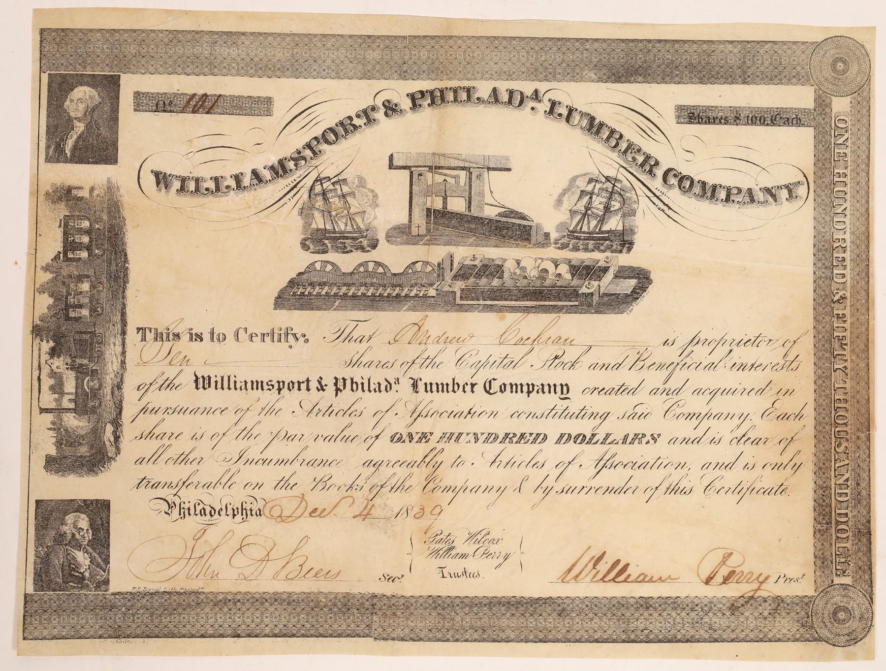 Gorgeous, early uncancelled lumber certificate! No. 101, issued for 10 shares to Andrew Cochran on Dec. 4th, 1839 in Philadelphia. Signed by president William Perry and secretary John D. Beers. Not cancelled. PS Duval Litho, Philadelphia. Black border and print, many vignettes: Benjamin Franklin, George Washington, an early locomotive, and multiple of lumber mill machinery and ships! Pinholes, creases, light wear. 7 x 9.25" Perry is listed on the certificate as a trustee, and this company was incorporated in 1839 with Andrew Cochran also involved. Richard Cochran (his brother?) later sued Perry, Cochran, and the company. The company "were the owners of a large body of unseated land in Lycoming county , containing 7302 acres 48 perches," according to Pennsylvania State Reports.