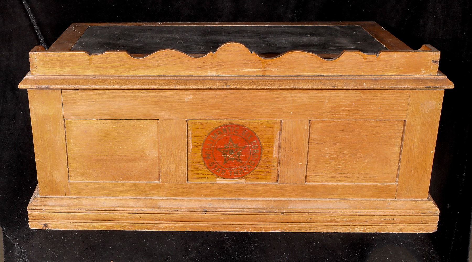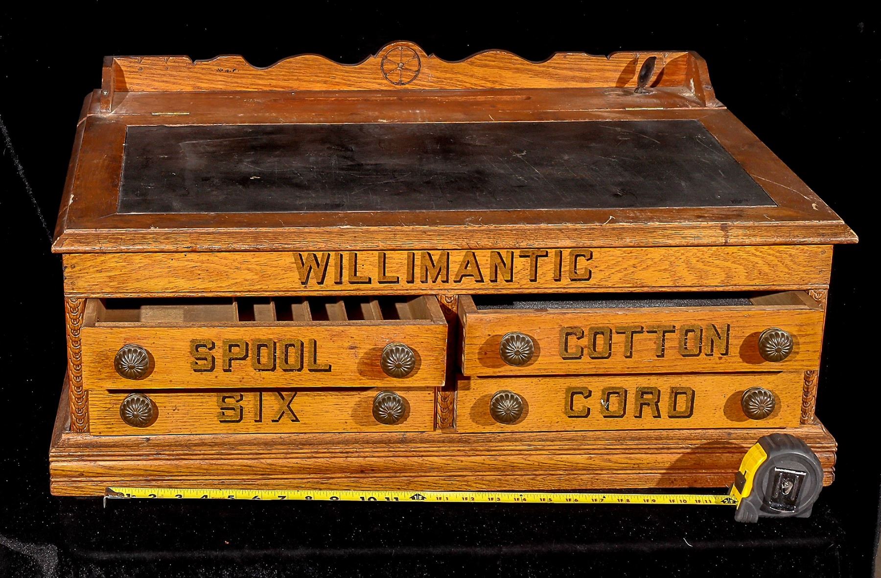 Willimantic Spool Cabinet used to hold spools of sewing thread. Slant-front writing desktop with inkwell site at upper right, pen and pencil holder in center. Four drawers marked // Willimantic / Six Cord / Spool / Cotton //. Made from straight-grained, quartersawn white oak. Finger-jointed drawers with some replaced panels. On the reverse is a 6-inch-diameter decal with // Willimantic 6 cord / star thread with a thread in the center. 31 x 24 x 14 inches, late 19th century. Gary Bracken Collection