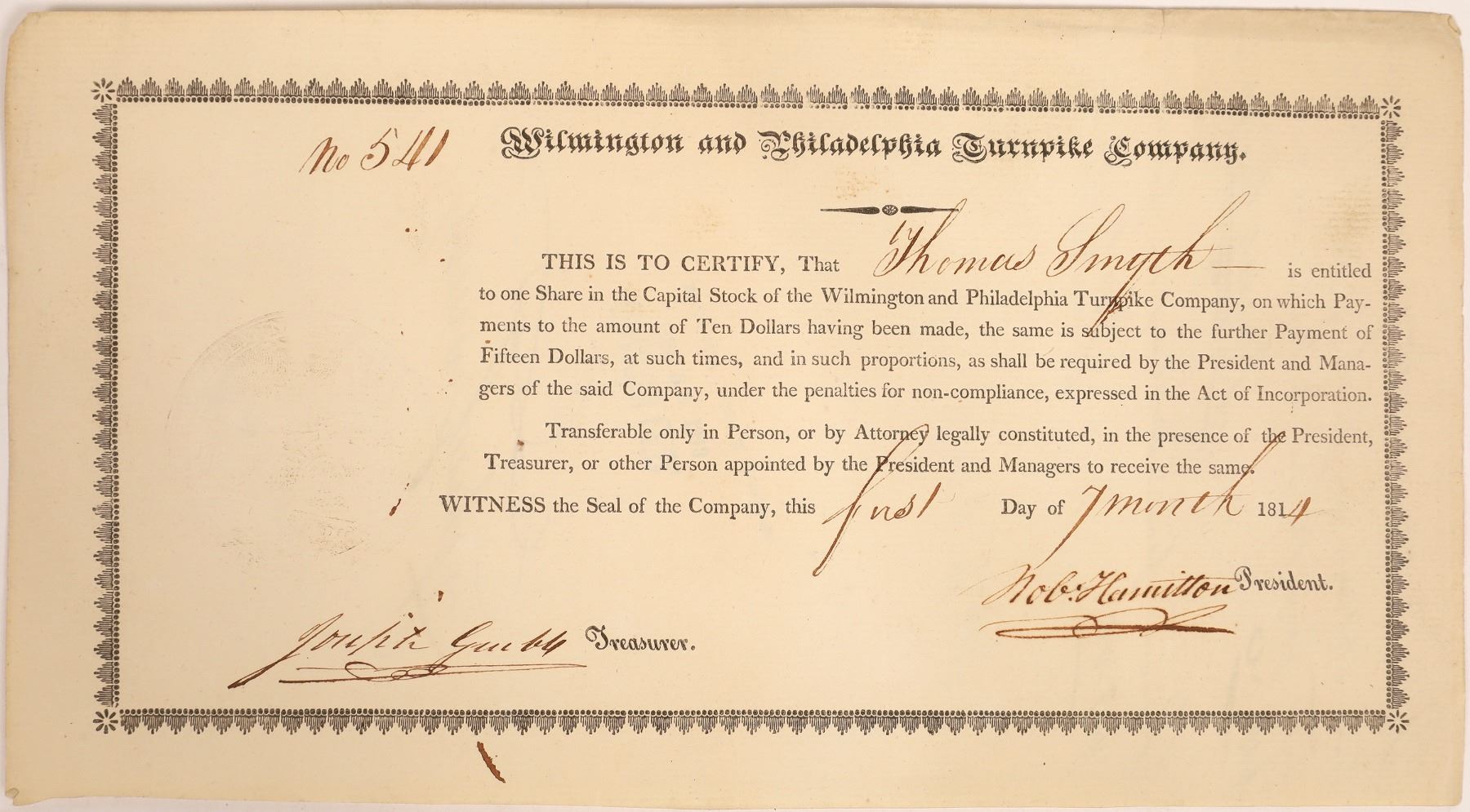 No. 541, issued to Thomas Smyth for one share in 1814. Signed by president Hamilton and treasurer Joseph Guible. Cancelled by stamp on the reverse in 1913. Endorsed by Smyth. 6 x 11" Some stains, small tear. In 1813, the Wilmington and Philadelphia Turnpike Company was chartered to build a turnpike running from the Brandywine Bridge in Wilmington northeast to the Pennsylvania border, where the roadway would continue to Philadelphia. A 3.75-mile long portion of the road near Wilmington was finished in 1816 with the remainder completed in 1823.