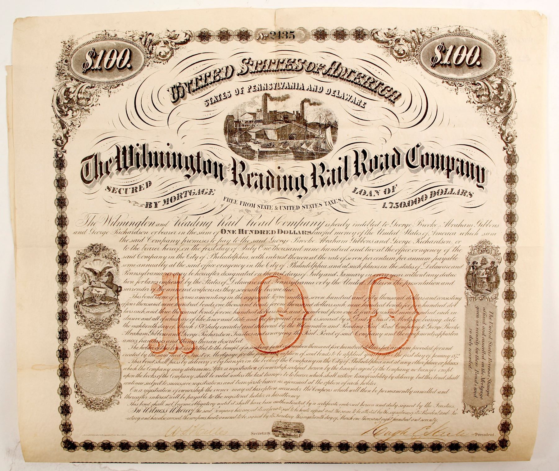 #2435 $100 7% 32 year bearer bond issued March 1 1870 signed by Hugh Estule President, black, embossed seal, 100 red underprint, four vignettes: Penn and Delaware State Seal, factory w/boats @ dock, train crossing bridge l-r. Coupons attached (missing six). Ef condition. rare. Printer J. Haehmlen, Goldsmith Hall. Ken Prag Collection
