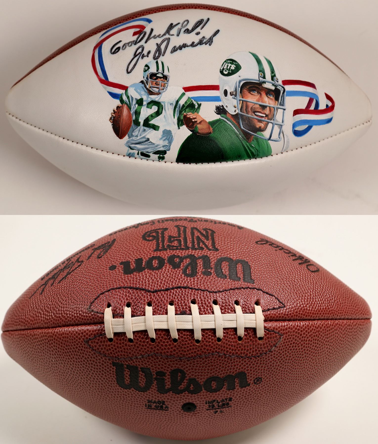 This is a Wilson Official NFL Football with pictures on Joe Namath on the back. Autograph is on the back side in black ink. Autograph says, "Good Luck Pal! Joe Namath". Football looks to be in very good condition. This is a very good looking collectors item! City: State: Date: