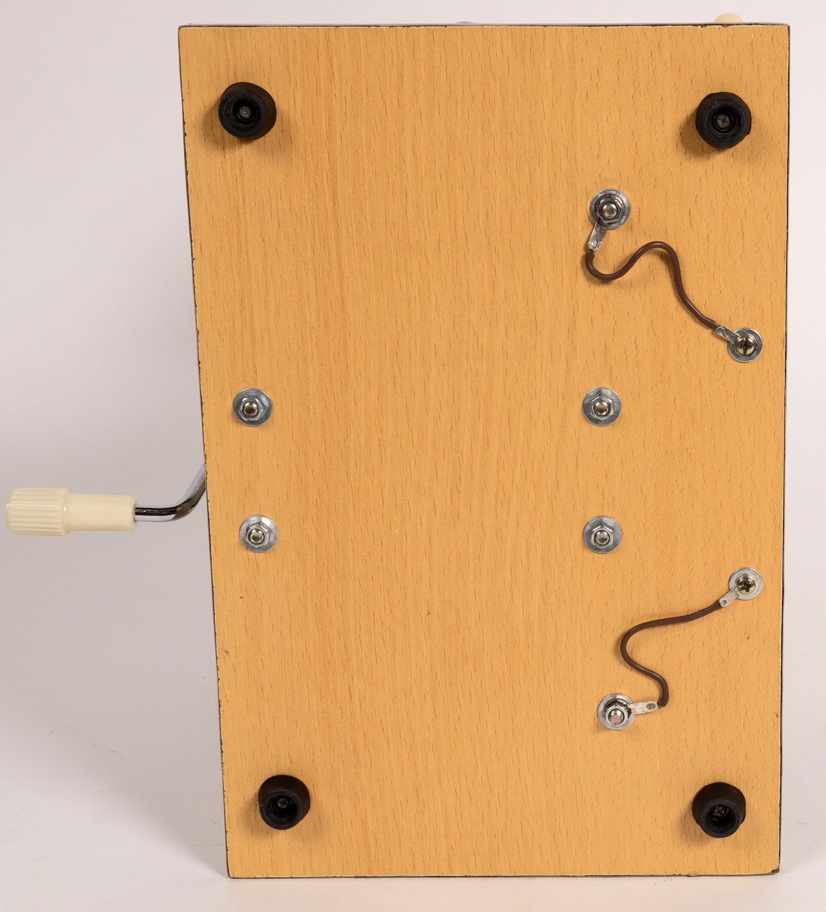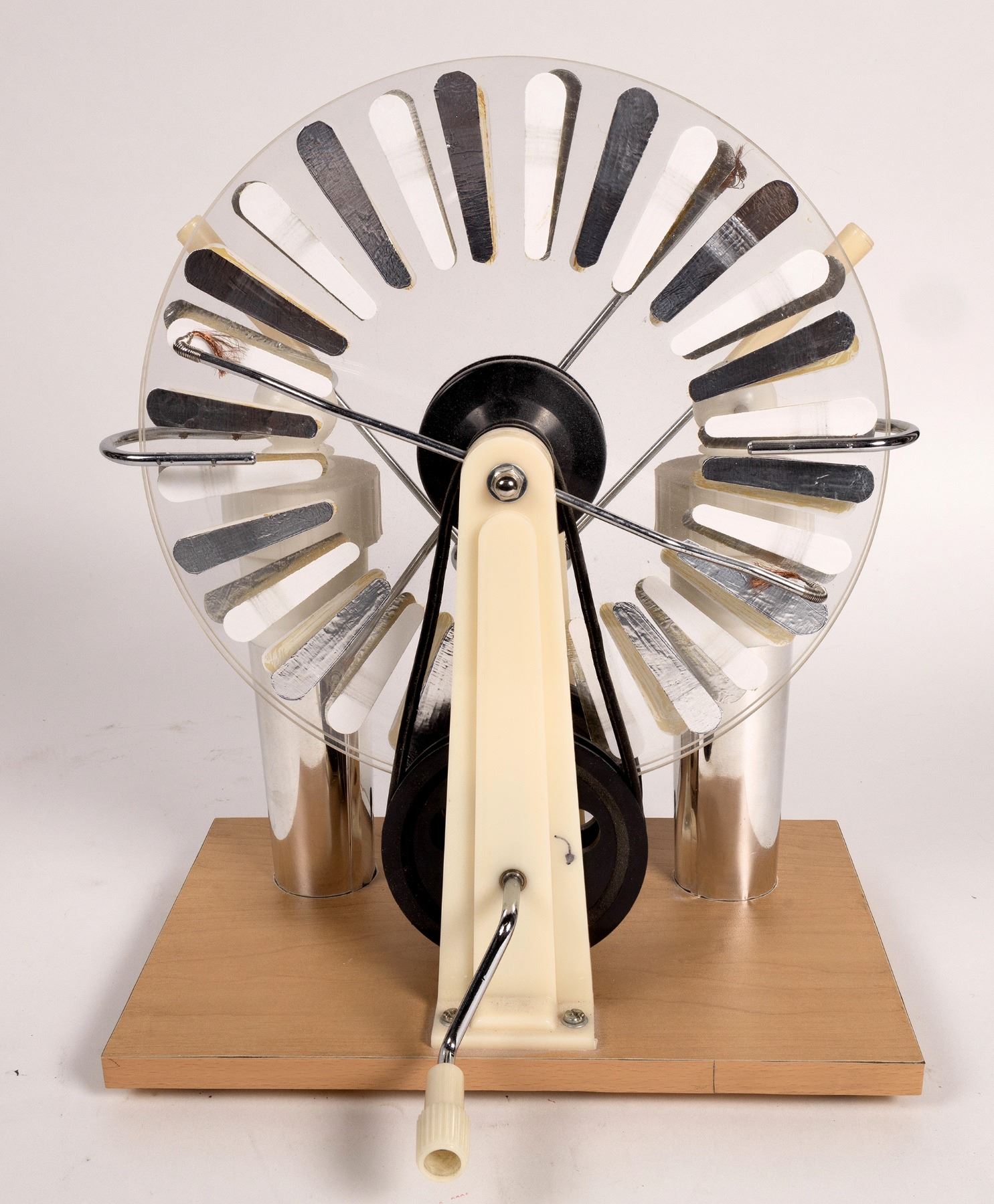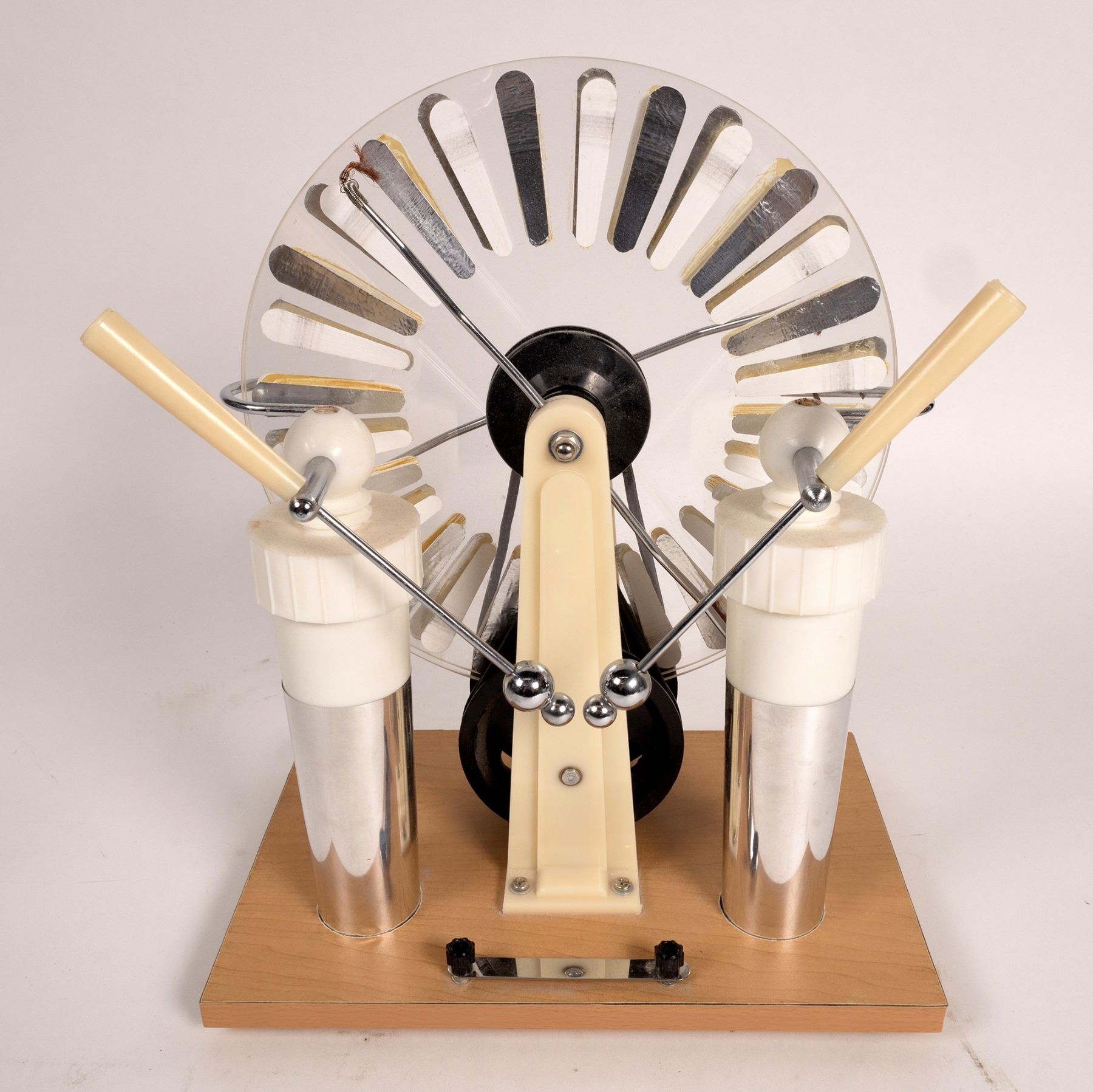 A Wimshurst Machine generates an electric potential between two electrodes using the principle of electrostatic induction. The key parts are two counter-rotating dielectric disks spun by two pulleys and a crank, two Leyden jars that store the electrical charge, two double-ended brushes (one on each side), two collecting combs that wrap around the two disks, and an adjustable spark gap. When the crank is turned, electrical charge moves and collects in the Leyden jars until the voltage is sufficient to jump across the spark gap. This commercial model is well made and generates a nice spark when cranked. Some minor adjustments could make this function even better. The two rubber belts are cracking and will need to be replaced eventually. Base is 12 x 8 inches, and it is about 16 inches tall. This Wimshurst Machine is clean and a delight to behold, spinning and sparking or not. James Wimshurst (1832-1903) was an English inventor who worked as a shipwright and spent his free time inventing. He improved on the electrostatic generators of others to the extent that his "duplex machine" was named after him.