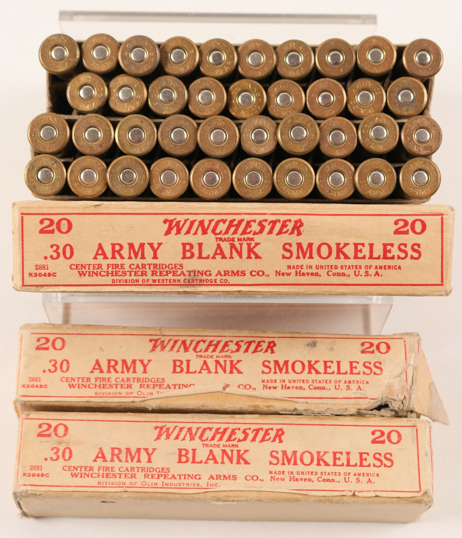 This is a lot of three 20 round cartridge boxes marked Winchester .30 cal. Army Blank Cartridges. Used for army training purposes. No sales to California, Hawaii, New Jersey, Connecticut, and New York City.