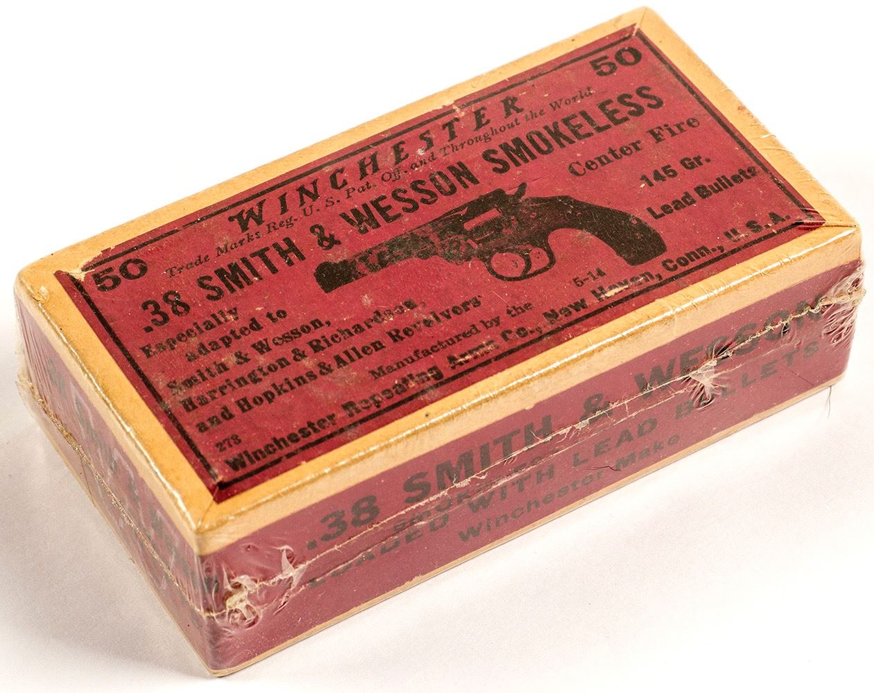 This is a one piece box of 50 cartridges for the .38 caliber Smith & Wesson, Harrington & Richards, and the Hopkins & Allen revolvers. The beautiful red label identifies this as being made by Winchester Repeating Arms. These are center-fire 145 grain lead bullets in a side opening box; a must have for the collector of small frame revolvers chambered in .38 center fire. Estimated to have been made in 1914. ITEM CANNOT BE SOLD TO CALIFORNIA BUYERS. Date: Location: HWAC# 55249