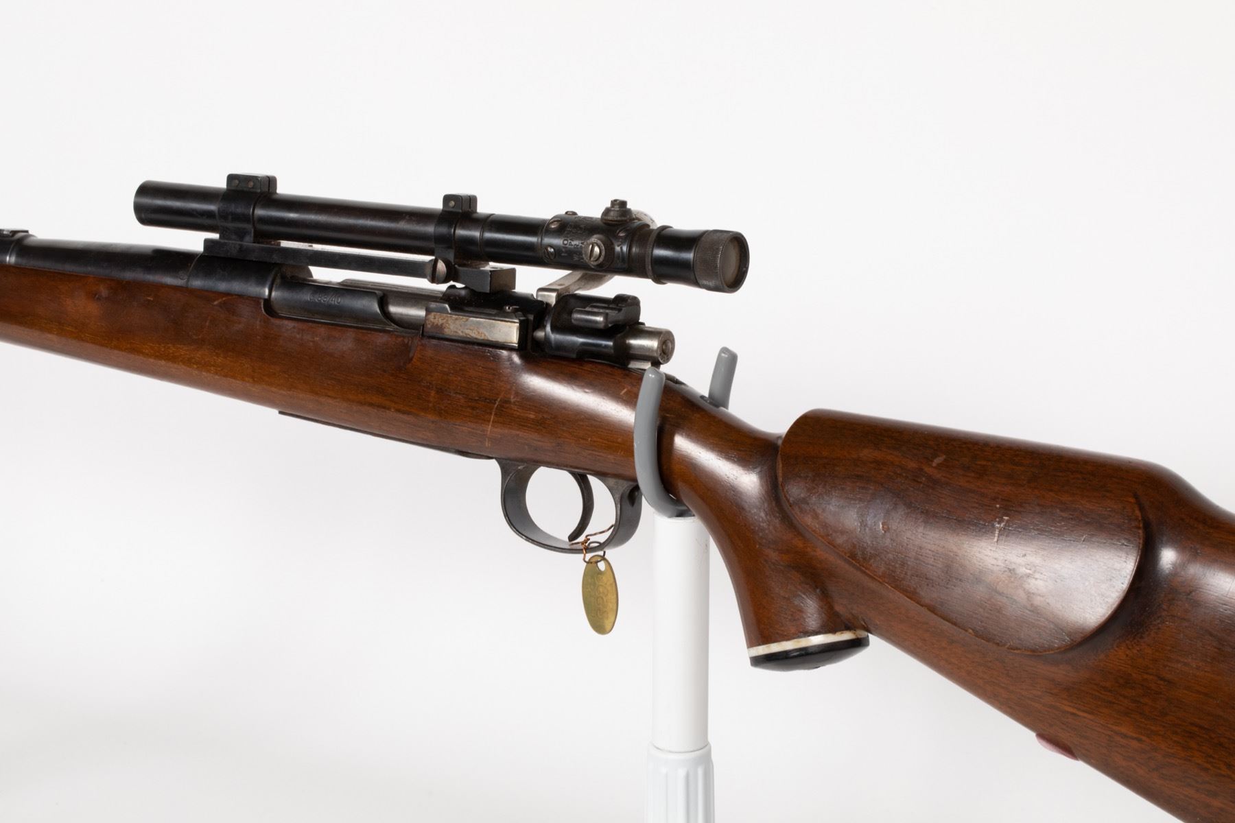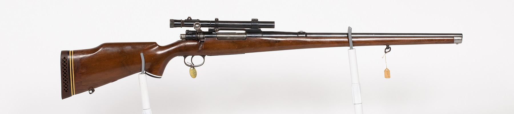 This is a WInchester sporting rifle with a Manlicher stock design chambered in .25-3000 cal. and scoped. Customized in the 1950's. SN: 5660, JMD Oval Tag: 8652, Condition: Very Good, >> FFL IS REQUIRED <<