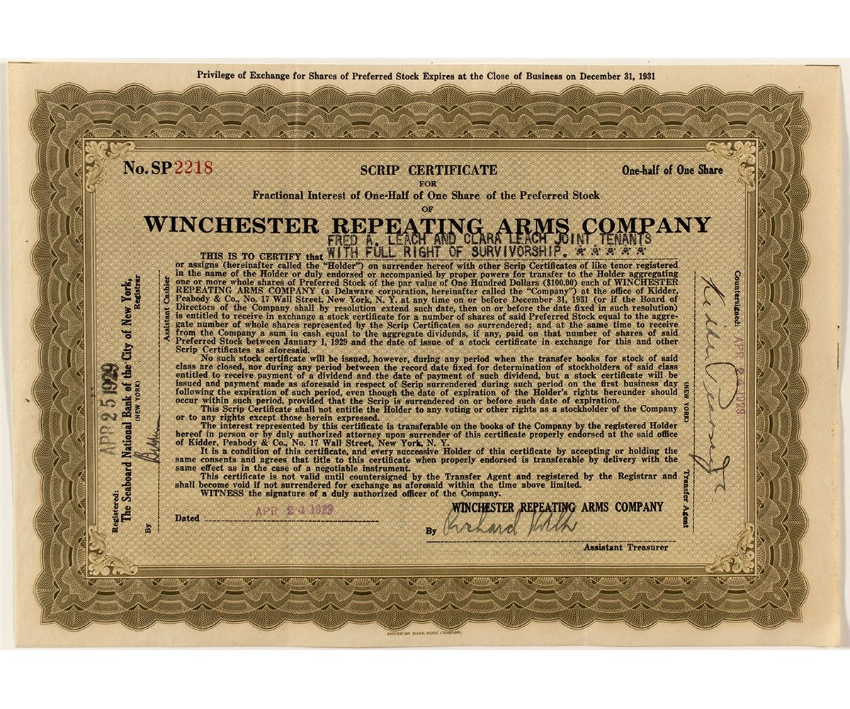 This is a fractional interest of one-half of one share of the preferred stock. Stock no. SP 2218 issued to Fred and Clara Leach on April 24, 1929. Besides a small stain on the lower right corner, and a couple creases, the stock has very little wear.City: County: State: Date: 1929