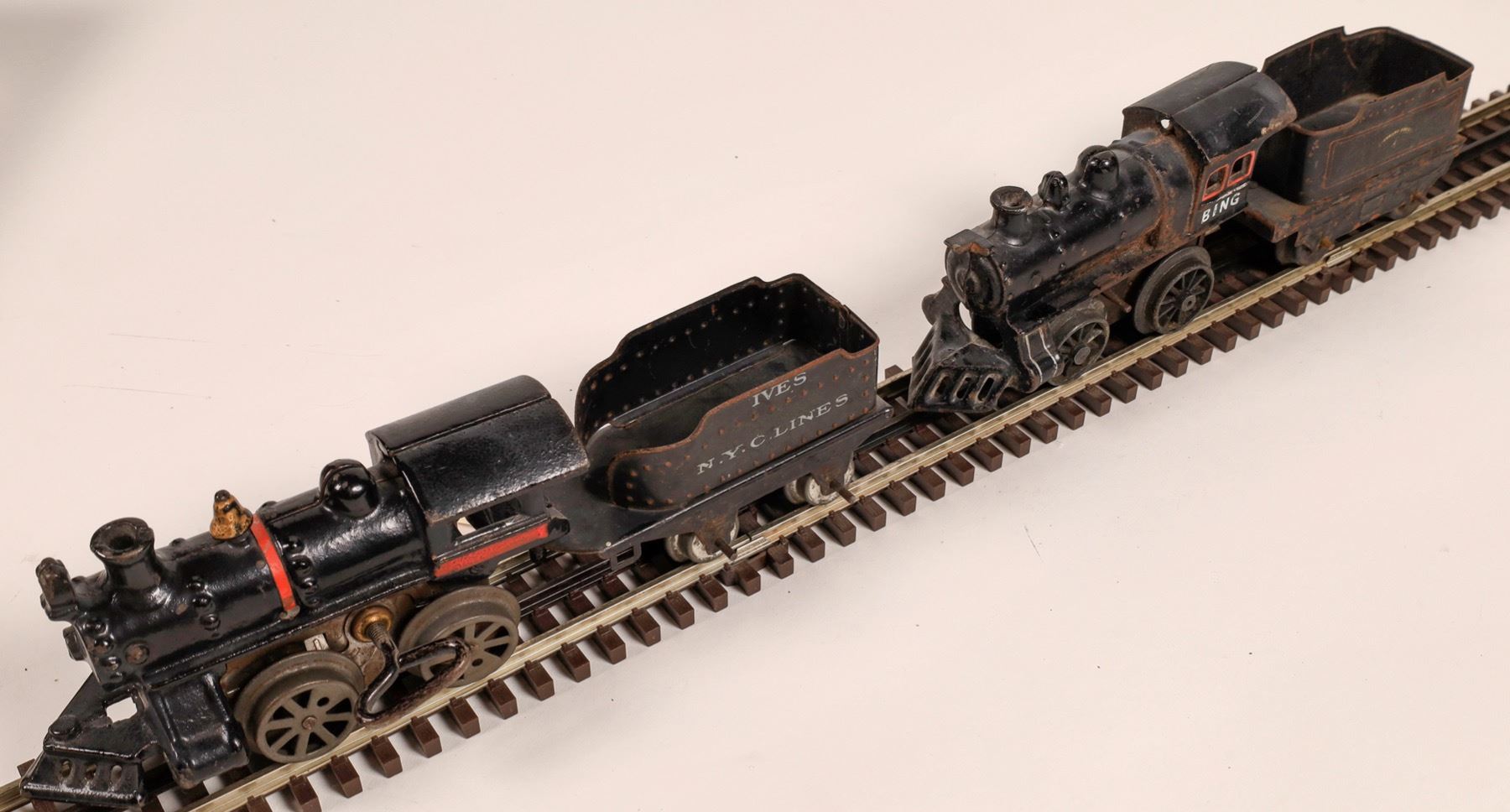 1) Cast Iron Loco, black and red. Tenders are tin. Unmarked. Ives. 2) Black Loco, with red trim, marked Bing on cab. Printing on tender is illegible. No damage. Good condition.