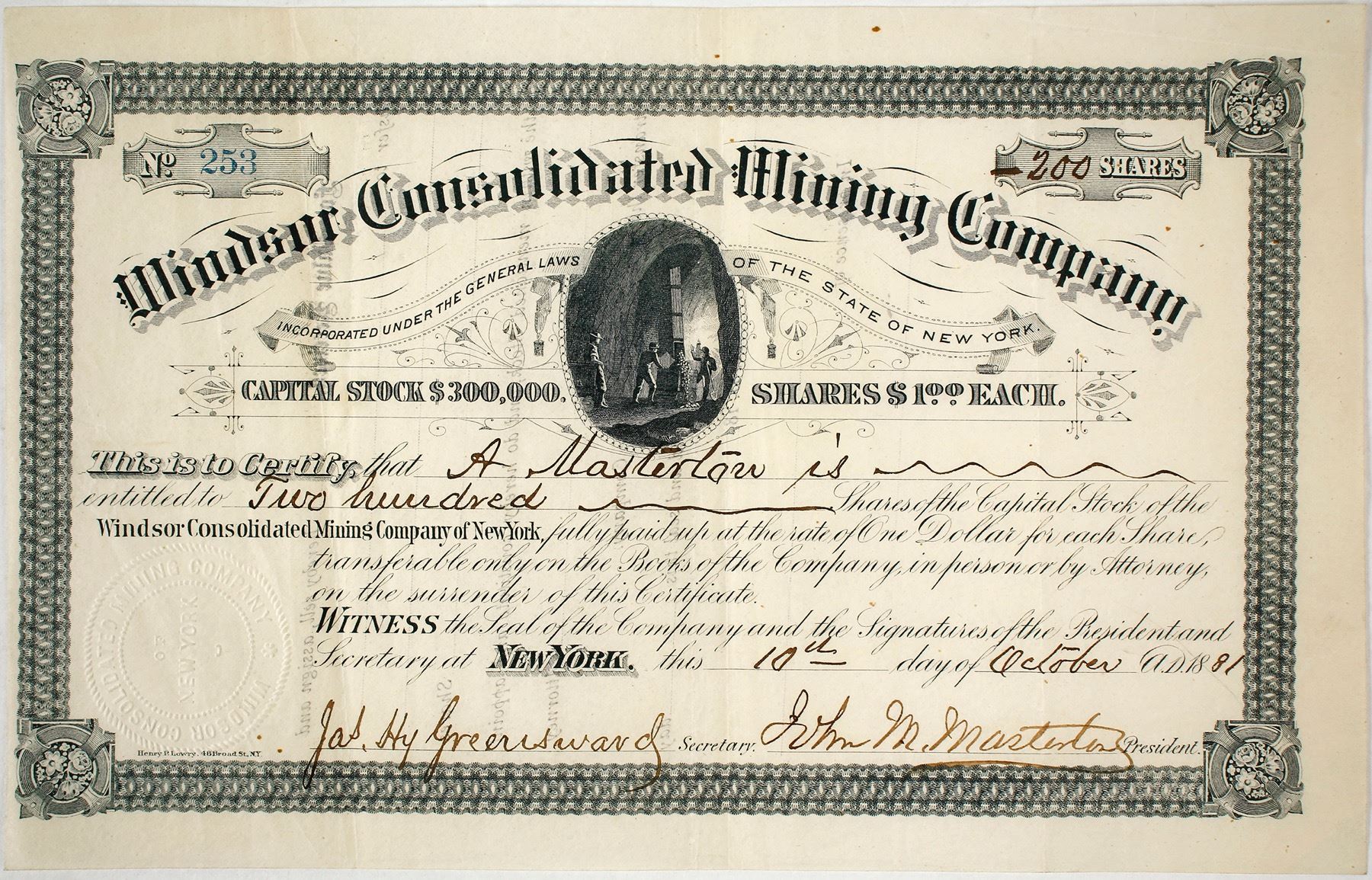 RARE! Number 253 for 200 shares to A Masterton. 1881. Signed by James Hy. Greensward and John M Masterton. Outside of a few pin holes and a small color stain on upper right border, this is nearly perfect! Unusual mining vignette of ore cars being loaded from a chute. Incorporated in Newy York. "In the vicinity of the King are the Last Chance and Mount View owned by the Windsor Consolidated Mining Company. The former has a shaft 400 feet and has produced ore worth $100 per ton. It is a four foot ledge. The Mount View is a three foot vein which has yielded $100 per ton." [Resources of Arizona: its MIneral... by Hamilton, 1884] (Laguna Collection)