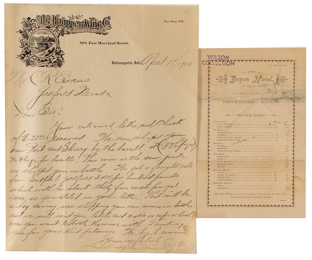 This is lot of 2 great pieces perfect for any wine connoisseur. 1) Wine list from the Depot Hotel of Reno, NV June 23, 1881. Dinners had a grand list of wine and liquors to choose from including G.H. Mumm's Extra Dry, Chateau Larose, Zinfandel and Cogniac. The Depot Hotel was built in 1879 next to the Central Pacific rail lines and provided rooms and meals for travelers. 2) Letter about an order from the Houppert Wine Co. to Goldfield, NV. The letter is dated April 17, 1915. Both items have some wear including creases.City: County: State: NVDate: