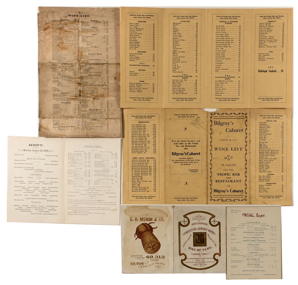 This is a lot of 6 different wine lists from various locations. 1) & 2) are both lists from the Bilgray’s Cabaret. Both provide and extensive list of wines, cocktails, and liquors to suit anyone’s needs. The location of this establishment is unknown, but it was located across from the Tropic Bar and Restaurant. 3) Academy of Music Maennerchor Carnival Mardi Gras bill of fare and wine list. This list was produced for the Maennerchor Garden Concerts 1880 Season. On the back there is an advertisement for G.H. Mumm & Co. 4) The Terrace wine list located in Sausalito. 5) August 23, 1880 menu for the Sagamore located in Lake George, NY. The hotel is still in operation. 6) Dinner and wine menu from an unknown location, although this one appears to be the oldest in the group. The range of wear on the items range from little to some wear. Some have tears and creases.City: County: State: Date: c1880
