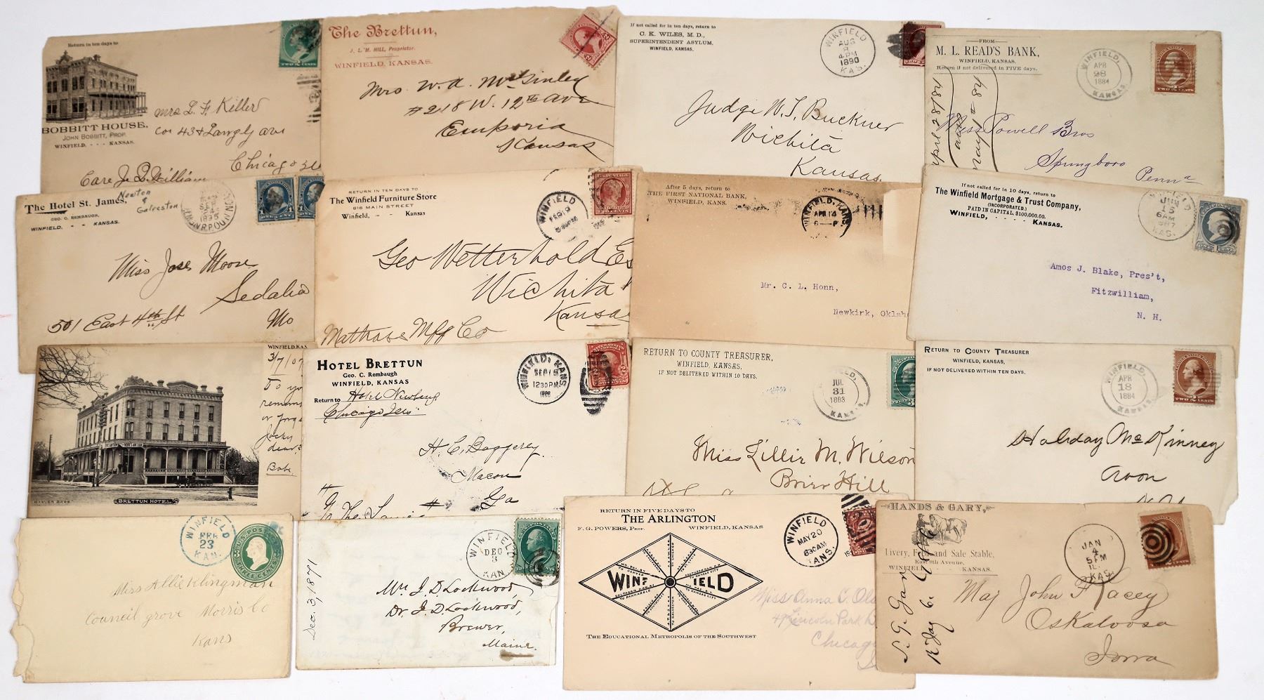 Lot of 15. 1) Hands & Gary with horse pictorial. Target killer. 2) The Arlington. FG Powers proprietor. 1907. Diamond map of railroads and cities they go to. NICE!. 3) 1871 with letter. Strong strike. Two double circle 1883/4 covers from county treasurer. 4-15) Also Hotel Brettun, Winfield Mortgage, First National Bank, Winfield furniture, Hotel St. James, ML Read's Bank, CK Wiles MD and superintendent of the Asylum, Bobbitt House with pictorial of the building. Etc. c1870-1910.