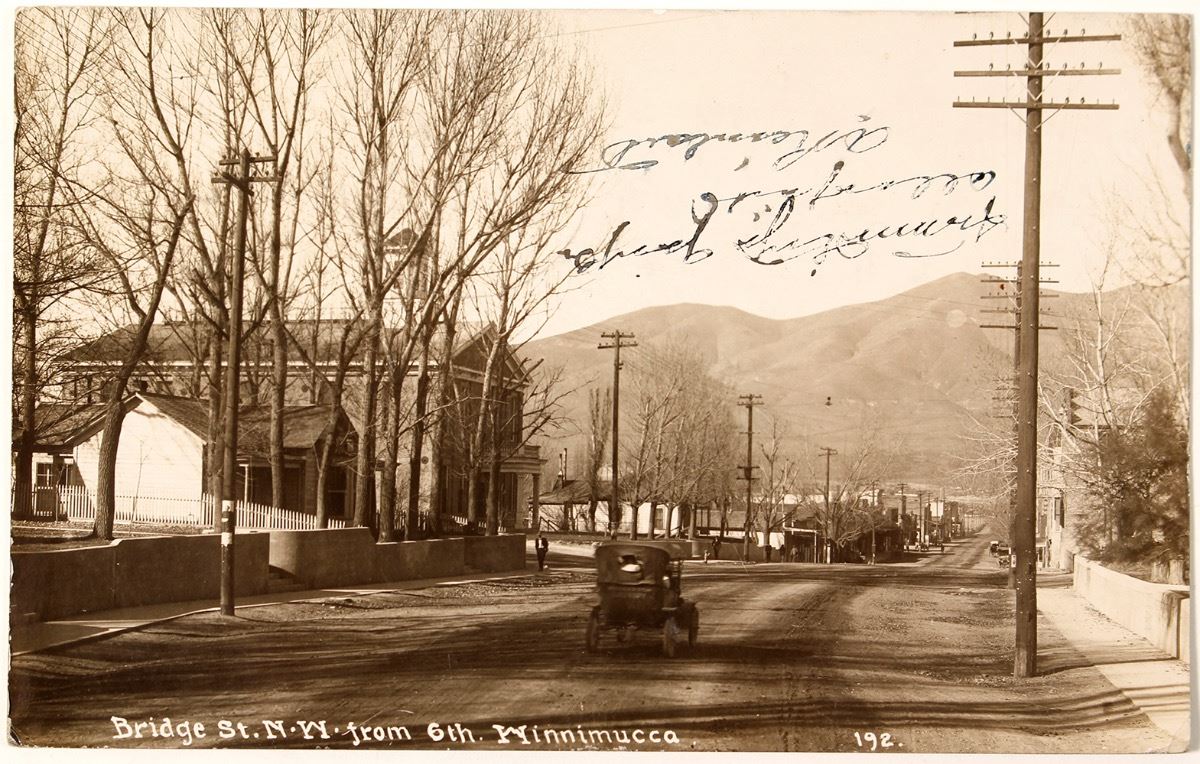 One lonely car driving on Bridge St. Northwest from 6th in "Winnimucca". Written in German to Frau Eismann in Munchen. Cancelled on the Ogden & San Francisco RPO. City: Winnemucca State: Nevada Date: 1915 ID# 44641