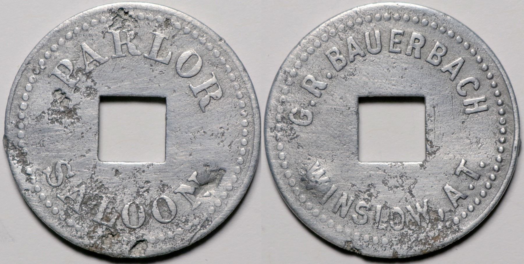 Winslow, A.T., Bauerbach Parlor Saloon, Bit coin, punched square in center