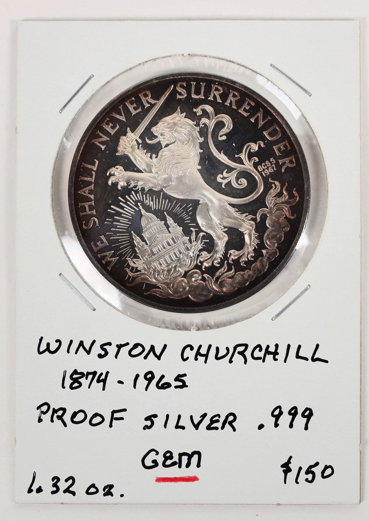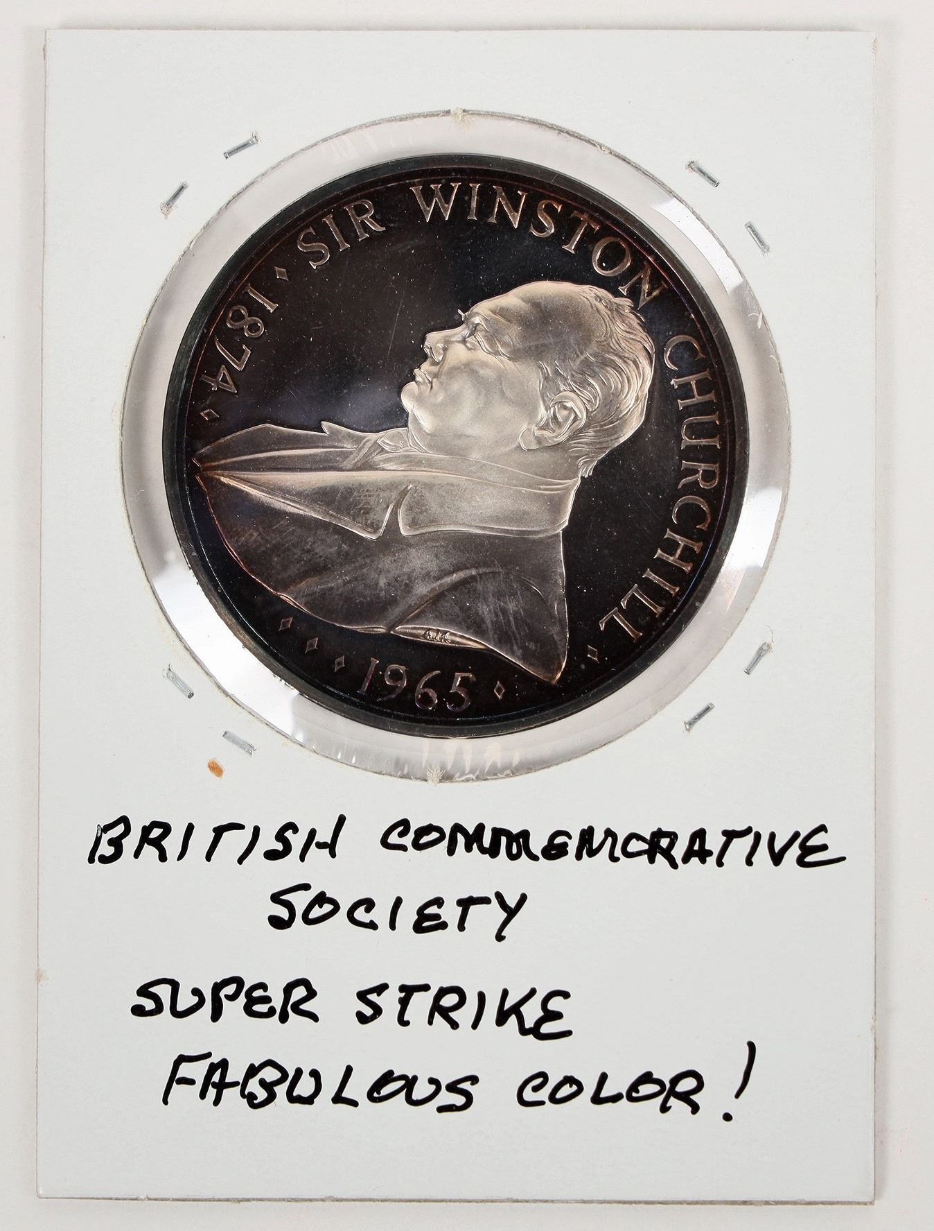 Issued by the Britannia Commemorative Society. Gem proof silver medal of Sir Winston Churchill 1874-1965. 1.32 ounces; 44 mm. Super strike with fabulous colorful toning! The silver 44 mm was issued only to members (The Franklin Mint struck 1395 for the society's North American members). Other sizes and metals were sold publicly.