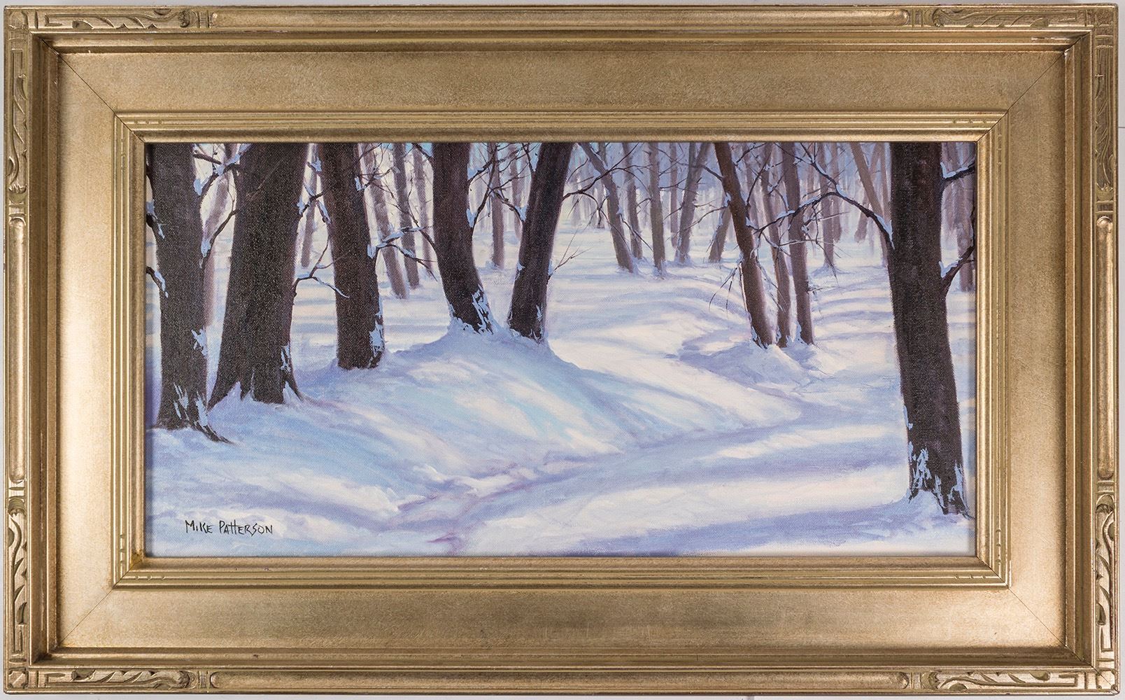Winter Shadows is a scene of trees in snow, oil painting by Mike Patterson. 12" x 24", beautifully framed 19" x 31". "My focus is on the beauty I see here in Montana. I find inspiration in this place and I try to express the sense of wonder it gives me. At the same time I am humbled by the ineptitude of my efforts, but buoyed by the pleasure I feel in being able to even make the attempt. I am a happy man! I expect this connection to Montana and its beauty to intertwine in the rest of my personal, professional and artistic lives. Painting gives me the opportunity to touch the reality of the place I love and to produce some work that may help others feel what I felt when I looked upon a part of Montana. Date: Location: Montana HWAC# 56849