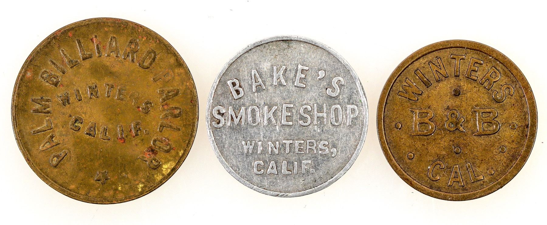 3 Winters tokens. B & B. Palm Billiard Parlor. Baker's Smoke Shop. Winters California