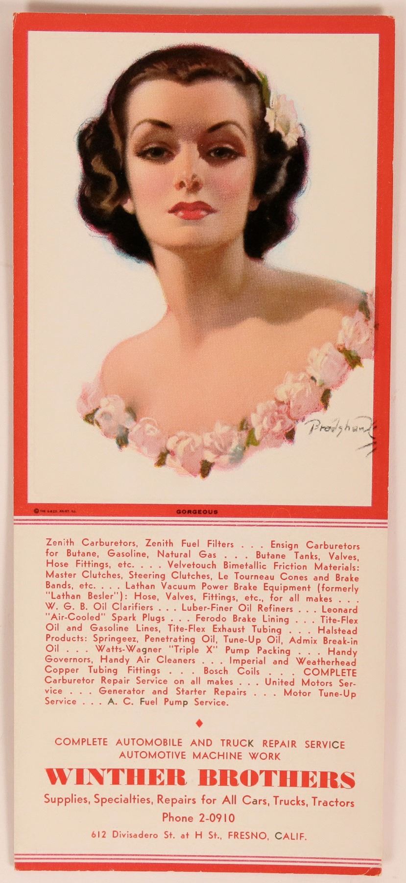 This blotter is an advertisement for Winther Brothers Supplies, Specialties, Repairs for All Cars, Trucks, Tractors in Fresno, CA. The artwork on the blotter features a glamorous woman and is titled "Gorgeous." It may be a work of art by Bradshaw Crandell, as the signature has some resemblance to the artist's original signature. The publishers are the Gerlach Barklow Co., Joliet, Il.