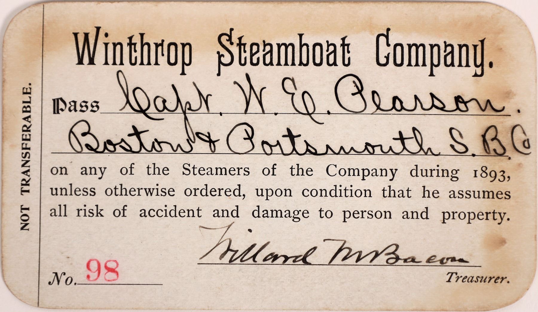 No. 98, issued for 1893 to Capt. WE Pearson of the Boston & Portsmouth Steamboat Company. Signed by treasurer Willard M. Bacon. Reverse blank. Printed on cardstock. Staining on front. Some residue on reverse. Operated from the Steamboat Wharf at Winthrop, Massachusetts to Batchelder's Wharf at Boston. Winthrop Massachusetts