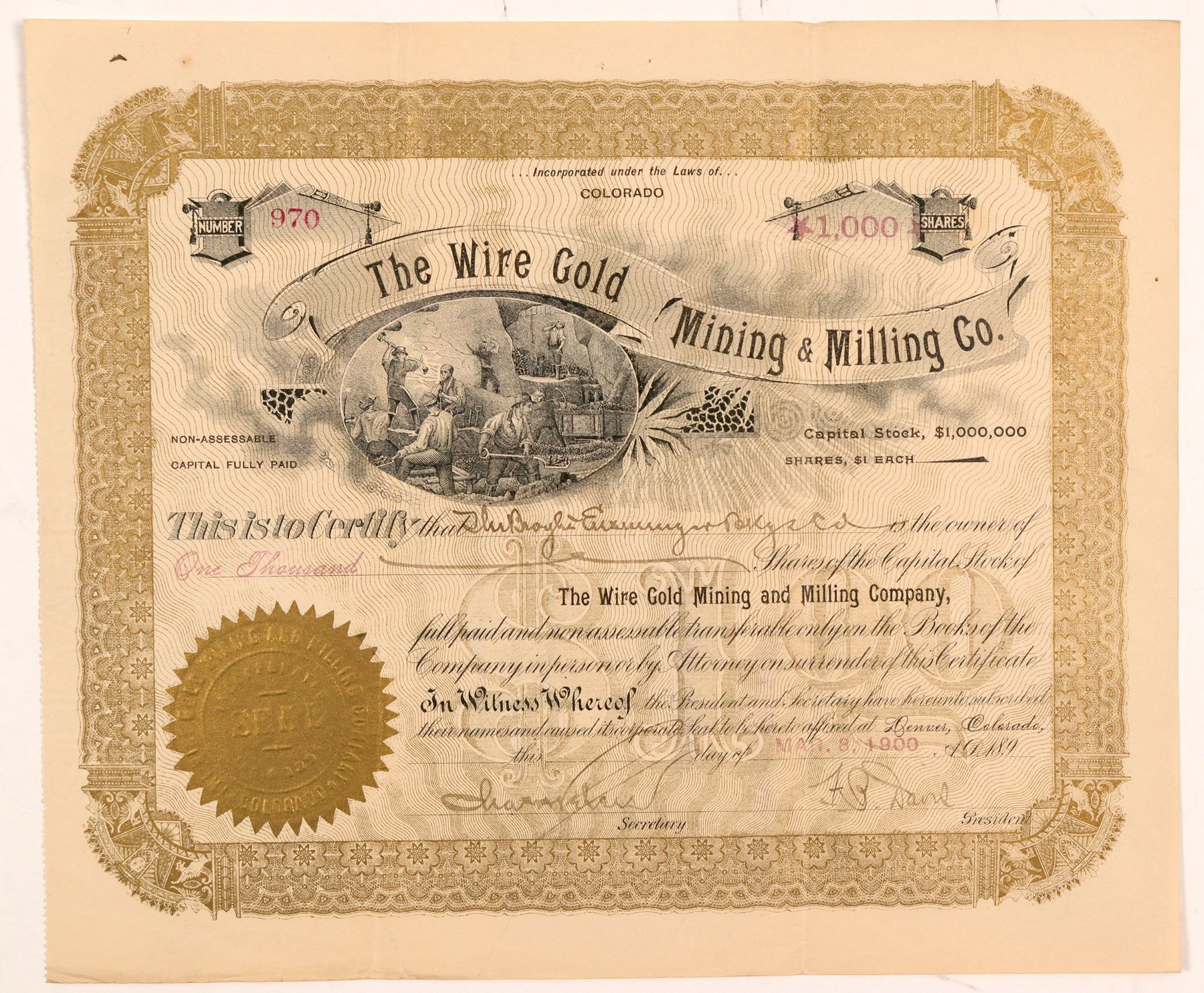 Inc. in Colorado. No. 970, issued for 1,000 shares on March 8th, 1900 in Denver. Signed by president FB Davie and secretary Charles Peters. Not cancelled. Gold border and seal, black print, ornate logo and underground mining vignette. Pinholes, folds, light wear. 8.25 x 10" According to Mining and Scientific Press, Vol. 93 (1906), the company had resumed sinking its new shaft on property in Black Canyon. The shaft is currently 35 feet deep. Free gold has been taken out of the surface workings. State: Colorado City: Gilpin County Date: 1900