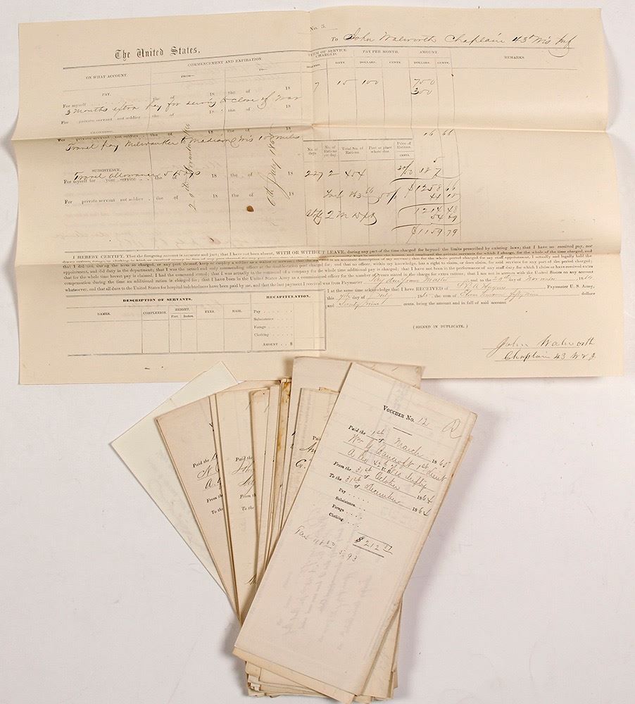 Lot of 17 military pay vouchers, issued 1862-1865. Each voucher is approx. 10 x 16.5" and includes allocations for pay and rations to the soldier and their servants, if any. Overall the group is in very good condition. Issued to soldiers such as: Capt. N.B. Van Slyke, 1st Lt. William Partridge, Major L. Silgreaves, Major William Kennedy, Capt. John W. Clark, Chaplain John Waleroth (at Camp Washburn in Milwaukee). Please inspect. (Prag Collection) Date: Location: Wisconsin HWAC# 55534
