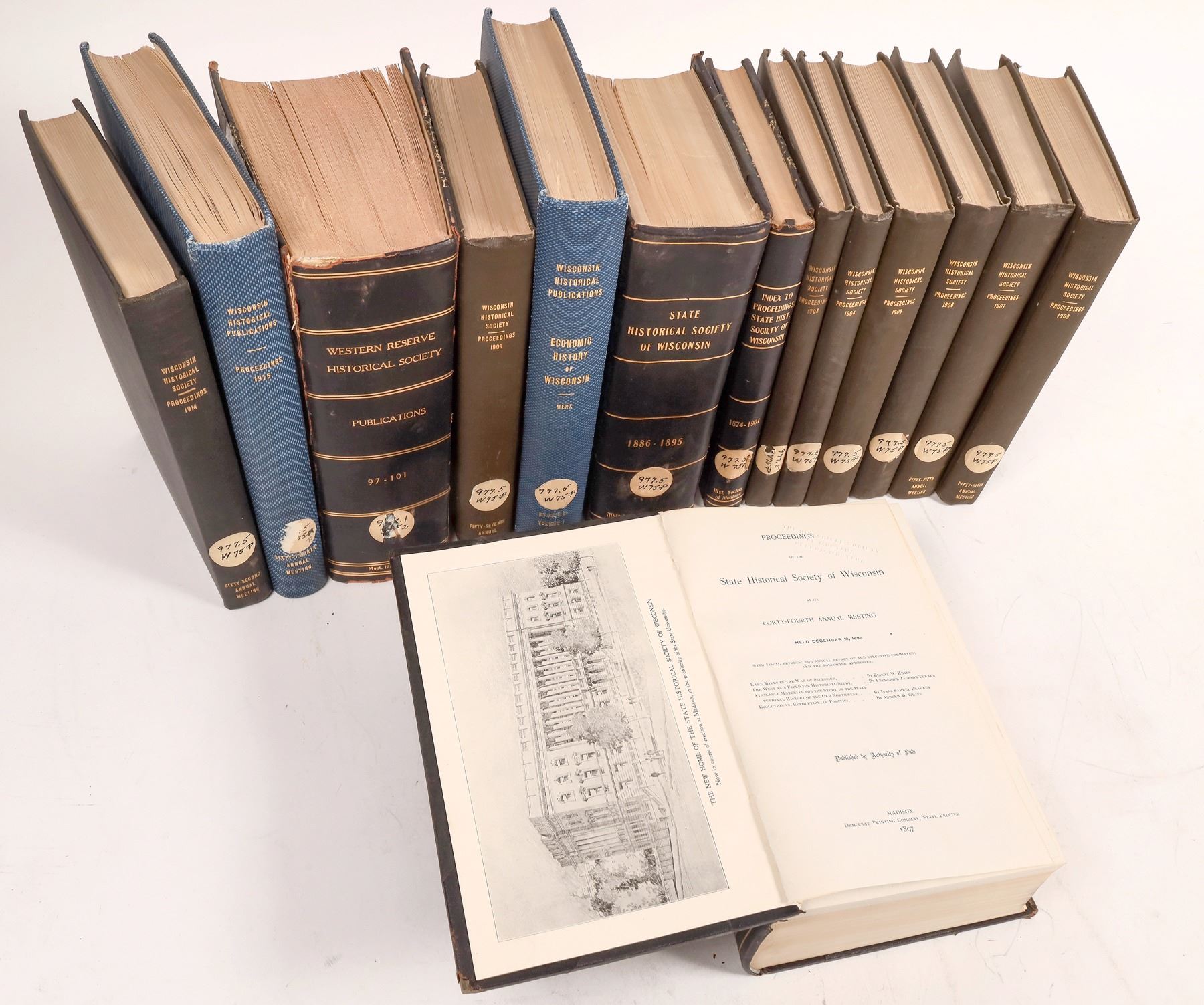 This collection of books published by the Wisconsin Historical Society covers state history through 1916. Economic History of Wisconsin by Merk vol.1; State Historical Society of Wisconsin 1886-1895, 1896-1902 in two volumes; Index to Proceedings State History of Wisconsin 1874-1901; Wisconsin Historical Society Proceedings 1903, 1904, 1905, 1906, 1907, 1908, 1909, 1914 ; Wisconsin Historical Publications Proceedings 1916; Western Reserve Historical Society Publications 97-101. From the Stuart MacKenzie Collection.