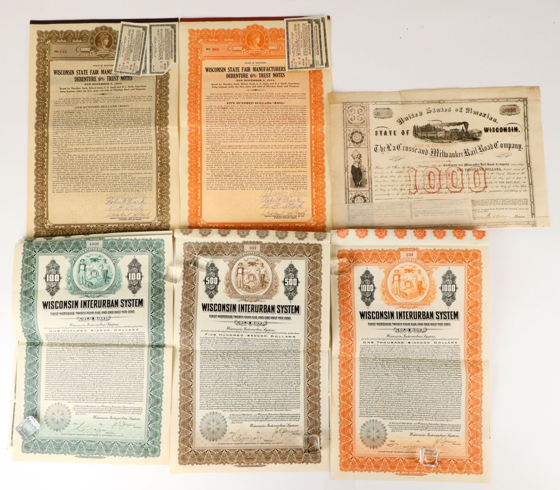 Lot of 6. 1-3) Three different gold bonds for the Wisconsin Interurban System. $100, $500, and $1000. 1917. 4) La Crosse & Milwaukee Rail Road Co. $1000 bond. 1857. Signed by president Kilbourn. 5-6) Two different Wisconsin State Fair Manufacturers Building bonds, $100 and $500. 1927.