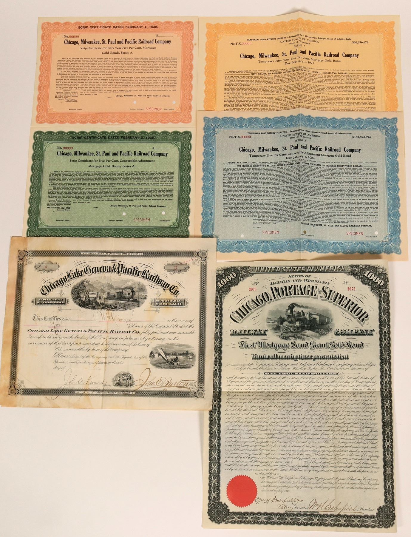 1. Chicago, Portage & Superior Railway Co $1,000 Land Grant Gold Bond- Cert. #3075, issued in 1881. $1,000 Land Grant gold bond, 40 year, 6%, due 1921. 45 Coupons attached. Train in oval vignette runs right to left. Franklin Bank Note, N.Y. Black on creme. 2. Chicago, Milwaukee, St. Paul & Pacific Railroad Co Specimen Bonds & Scrip - Four Specimen certificates includes two temporary bonds in blue and orange and two scrip certificates for bonds. All four have the date of February 2, 1925. The railroad was incorporated in Wisconsin. ABN, printer. Hole punches at the bottom to cancel. 3. Chicago, Lake Geneva & Pacific Railway Co Stock Certificate- Cert. #4, fully issued but not dated to W.H. Conger and signed by John E. Burton as president. Conger did endorse the certificate on the back in 1887, so that narrows the date range. Black, issued for 5 odd shares. Vignette of two people watching passing train. Shares were $100 Each. Total Capital Stock, $2,000,000. No sign of cancellation, but there is browning along the left border. Browning on the back side along that edge as well.