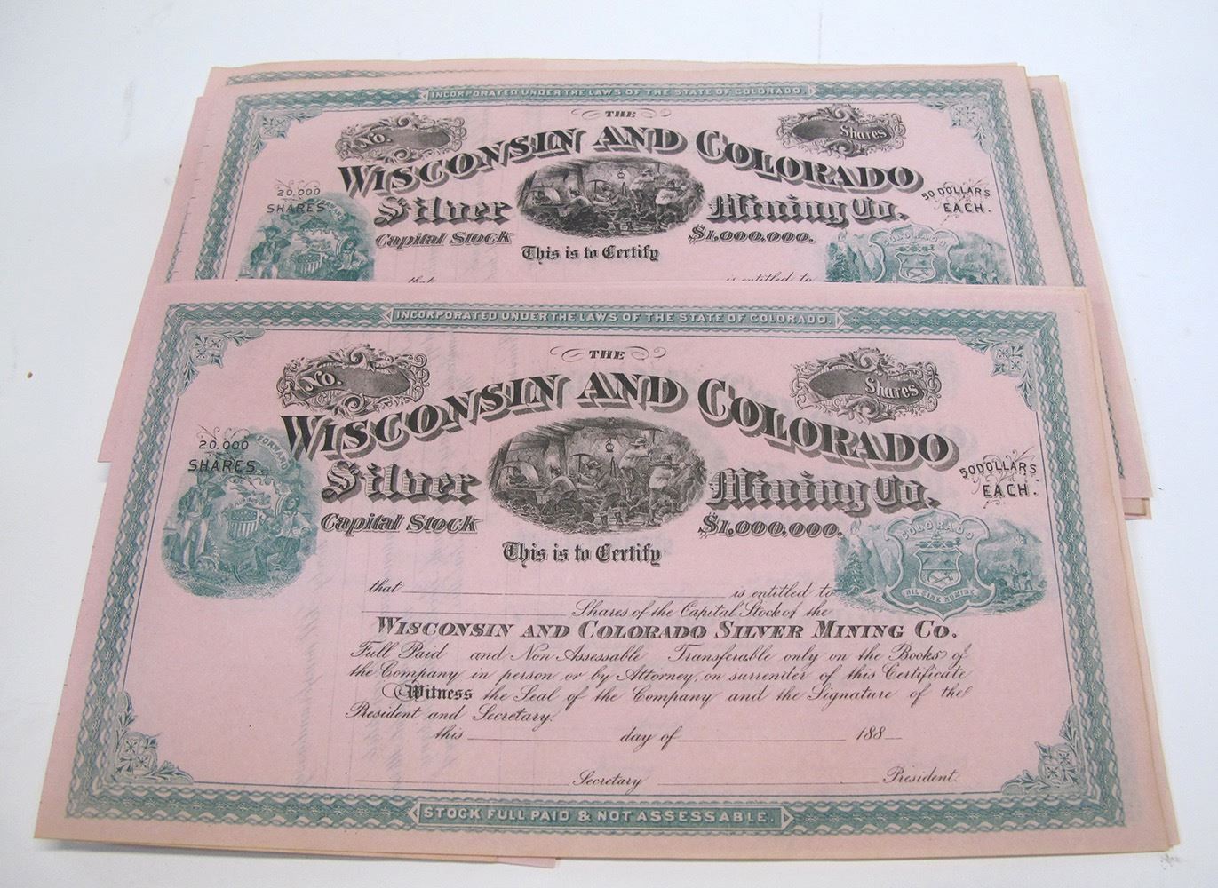 35 unissued $500 certificates. 5.75" x 10.5. Organized by financiers in Appleton, Wisconsin. Worked claims in the Cameron Mountain district north of Salida. Date: c. 1880's Location: Colorado HWAC # 53749