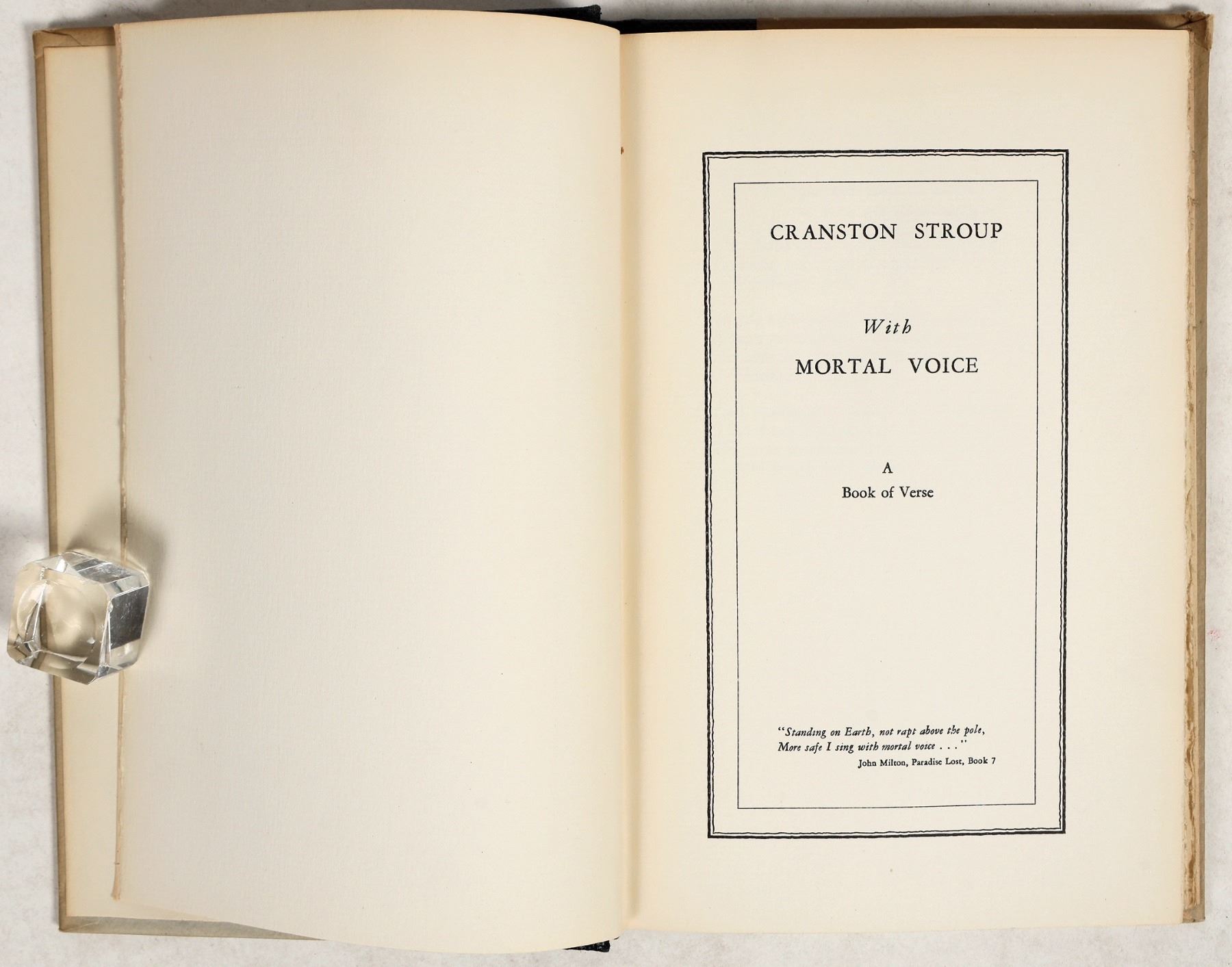 A limited-edition numbered copy of 'With Mortal Voice' by Cranston Stroup, a 1935 poetry book. The copy is numbered #70, and has deckled edges. Bears an inscription from a relative of the poet gifting the book to a friend on the inner cover. Fine condition, some discoloration/cosmetic wear; see photos. 5.75"x8.5"x.75".