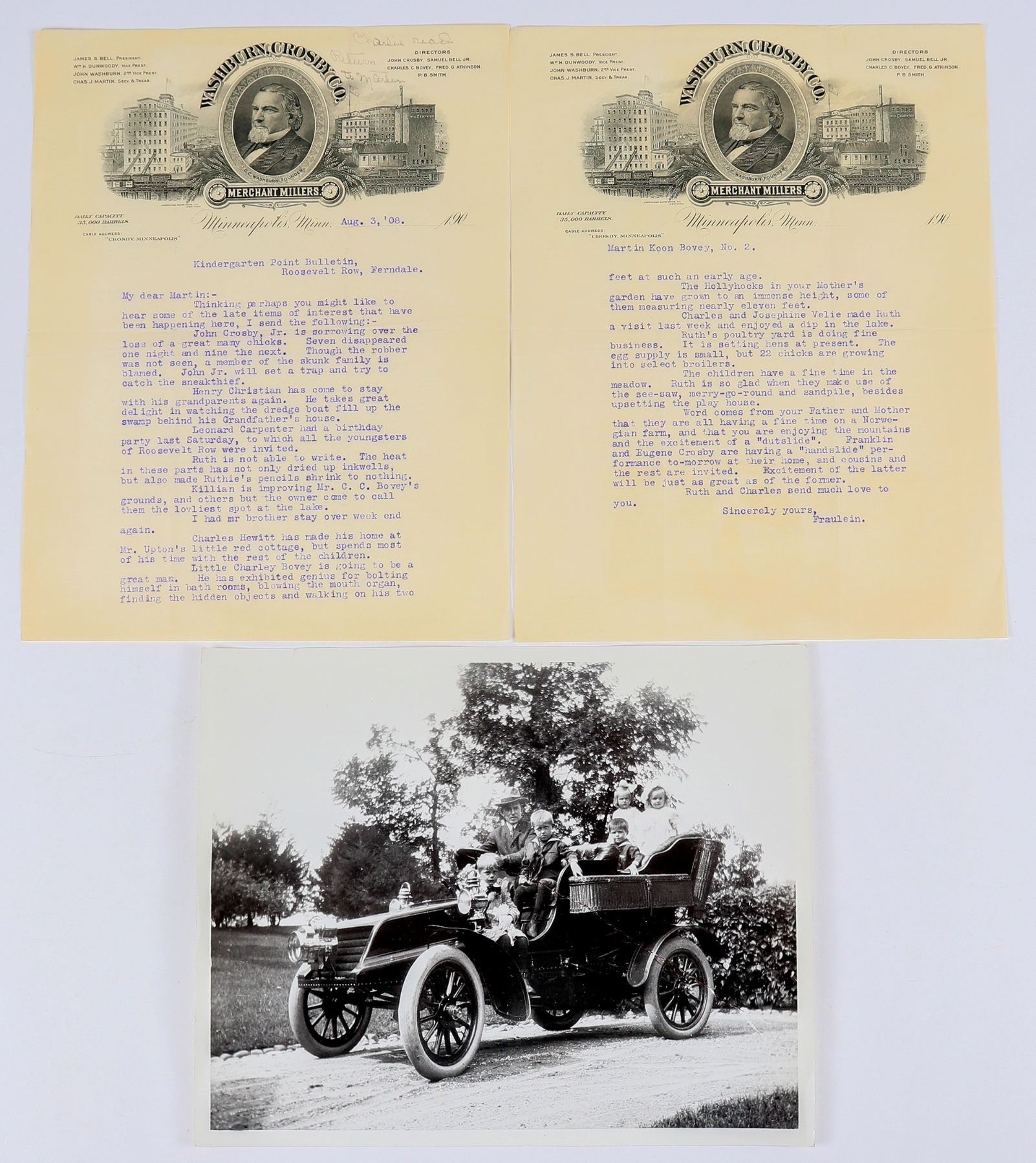 1908 pictorial letterhead from Washburn, Crosby Company from a witty author signed as Fraulien. References to a sneakthief chicken robbing racoon, heat drying up inkwells, 22 chicks growing into select broilers and more. Also an 8x10" antique car photo, occupants unknown. Minnesota