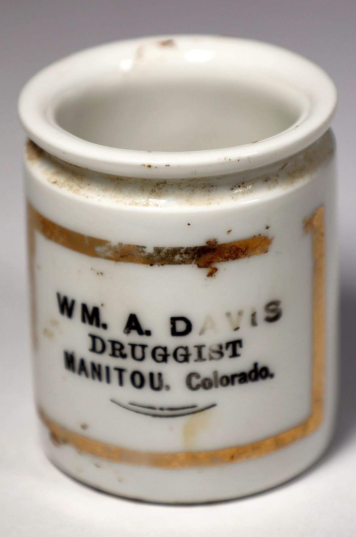 Unlisted. Wm. A. Davis / Druggist / Manitou, Colorado. Black lettering with gold highlights on white jar. Stains on bottom and around rim. No lid. Some of the gold and lettering has worn off. 2"H x 1.5"D. Isaac Davis built a 3 story building in the 1880s that housed his pharmacy. William was his son. Isaac died in 1891 and the business was taken over by other family members.
