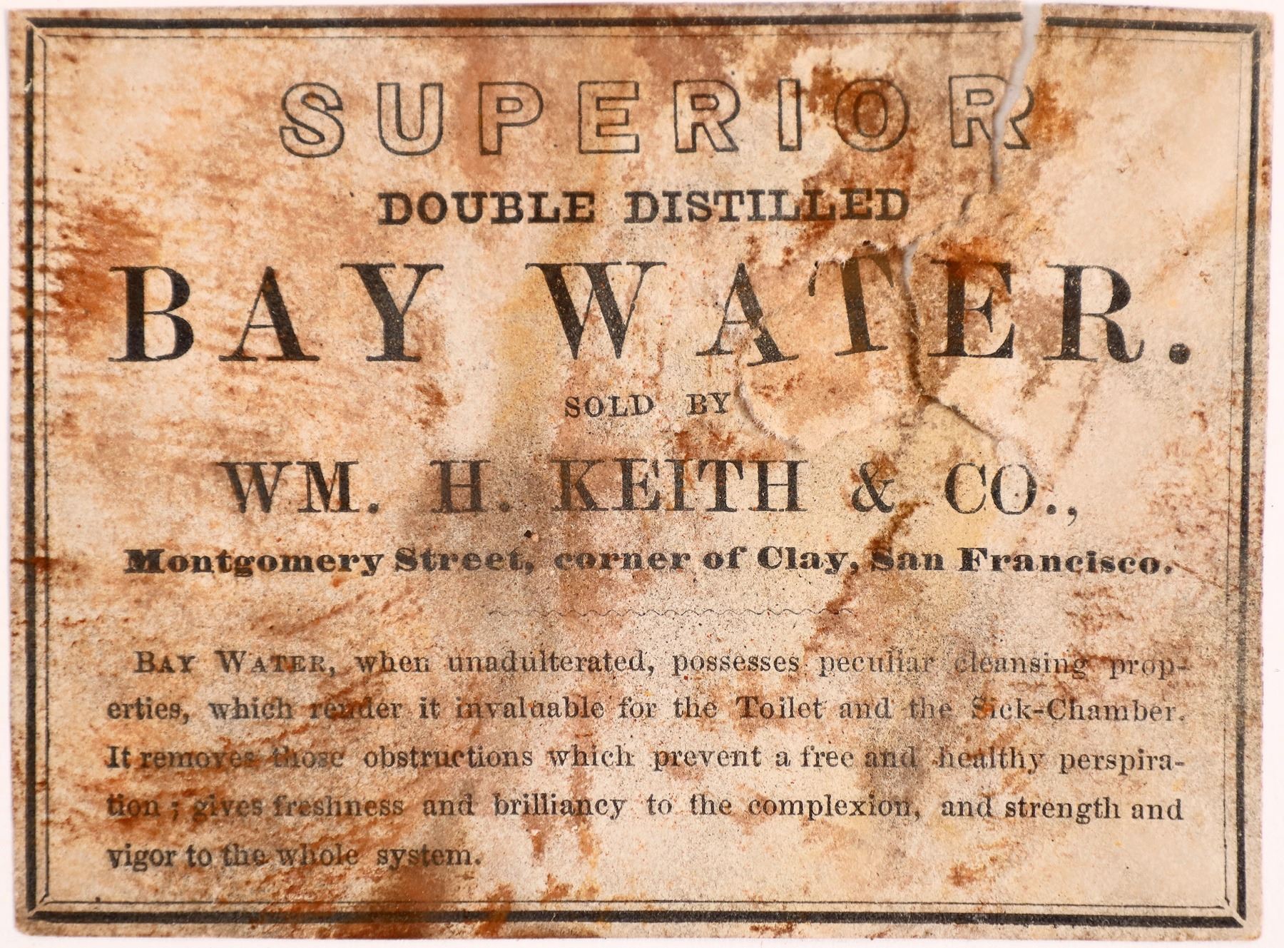 William H. Keith was a San Francisco Gold Rush apothecary. Very busy during the 1856-1858 period. Previously, I had written that there are no known embossed bottles from him. This is incorrect, according to our friend Tom Quinn, who states that a clear cylindrical bottle with vertical embossing is most often seen (though scarce to rare-fh), as well as a "large flat oval in clear and aqua." Interestingly, Keith has almost the exact same name as world famous California landscape artist William Keith, who did not come to San Francisco until 1859. This label adorned a bottle in the Easton trunk. Easton bought this distilled Bay Water as either a medicinal cure for ailments, or as a perfumed, Florida Water style content.